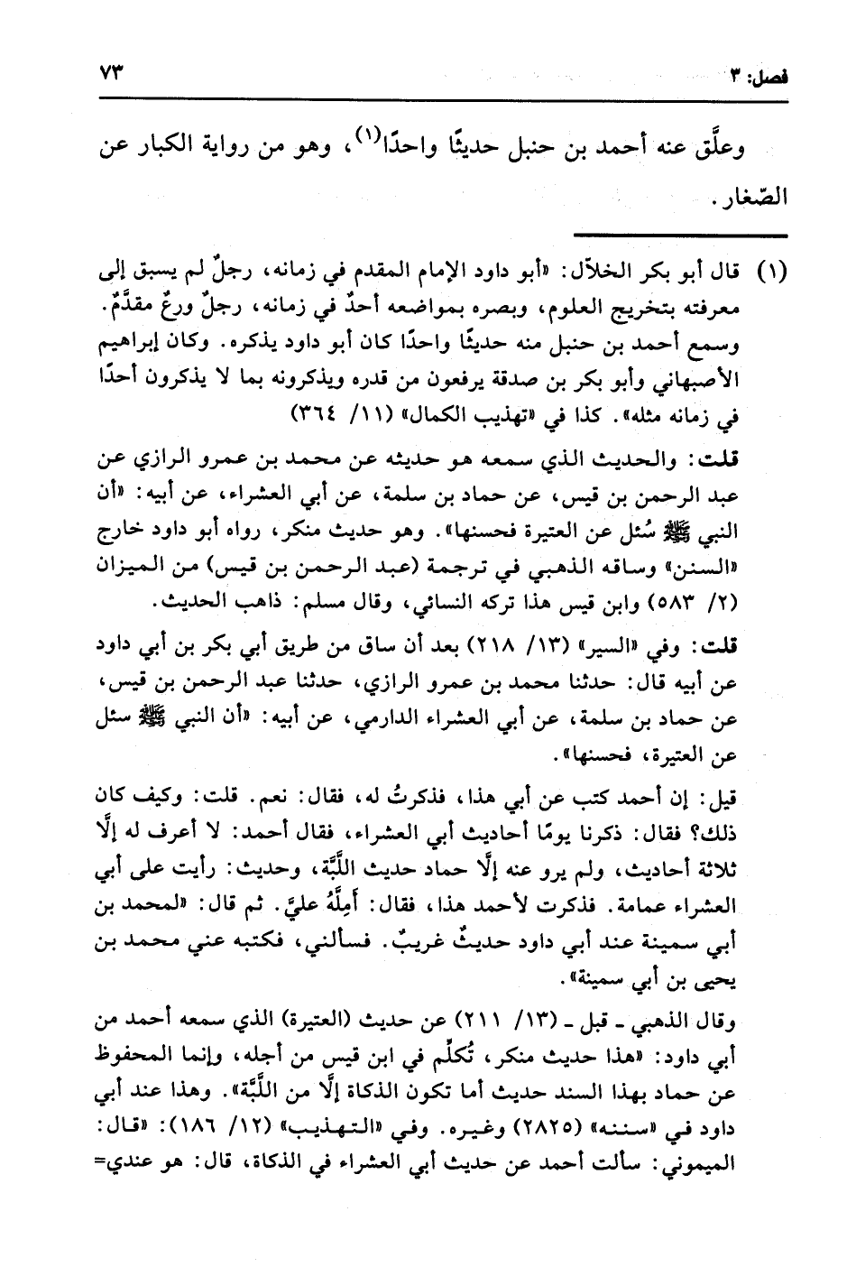 وقال الذهبي -قبل- (13/ 211) عن حديث (العتيرة) الذي سمعه أحمد من أبي داود: "هذا حديث منكر، تُكلِّم في ابن قيس من أجله، وإنما المحفوظ عن حماد بهذا السند حديث أما تكون الذكاة إلاَّ من اللَّبَّة". وهذا عند أبي داود في "سننه" (2825) وغيره. وفي "التهذيب" (12/ 186): "قال: الميموني: سألت أحمد عن حديث أبي العشراء في الذكاة، قال: هو عندي =