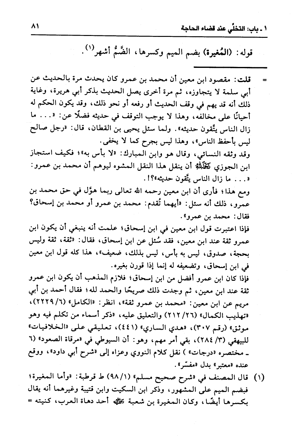 فإذا كان ابن عمرو أفضل من ابن إسحاق؛ فلازم المذهب أن يكون ابن عمرو ثقة عند ابن معين، ثم وجدت ذلك صريحًا والحمد لله؛ فقال أحمد بن أبي مريم عن ابن معين: "محمد بن عمرو ثقة"، انظر: "الكامل" (6/ 2229)، "تهذيب الكمال" (26/ 212) والتعليق عليه، "ذكر أسماء من تكلم فيه وهو موثق" (رقم 307)، "هدي الساري" (441)، تعليقي على "الخلافيات" للبيهقي (3/ 284)، بقي أمر مهم، وهو: أن السيوطي في "مرقاة الصعود" (6 - مختصره "درجات") نقل كلام النووي وعزاه إلى "شرح أبي داود"، ووقع عنده "معتبر" بدل "مفسّر".