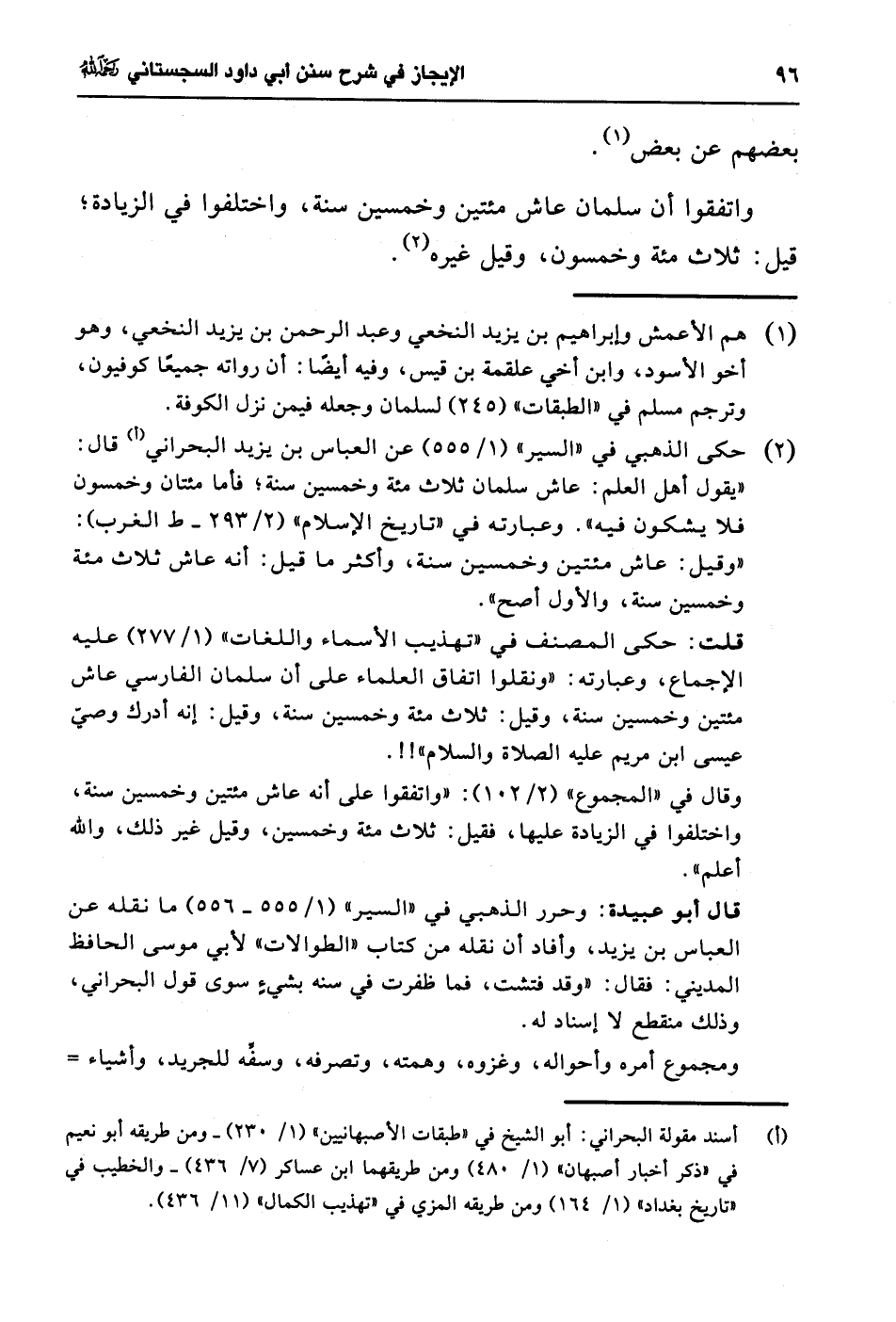 (¬2) حكى الذهبي في "السير" (1/ 555) عن أبو العباس بن يزيد البحراني (أ) قال: "يقول أهل العلم: عاش سلمان ثلاث مئة وخمسين سنة؛ فأما مئتان وخمسون فلا يشكون فيه". وعبارته في "تاريخ الإسلام" (2/ 293 - ط الغرب): "وقيل: عاش مئتين وخمسين سنة، وأكثر ما قيل: أنه عاش ثلاث مئة وخمسين سنة، والأول أصح".