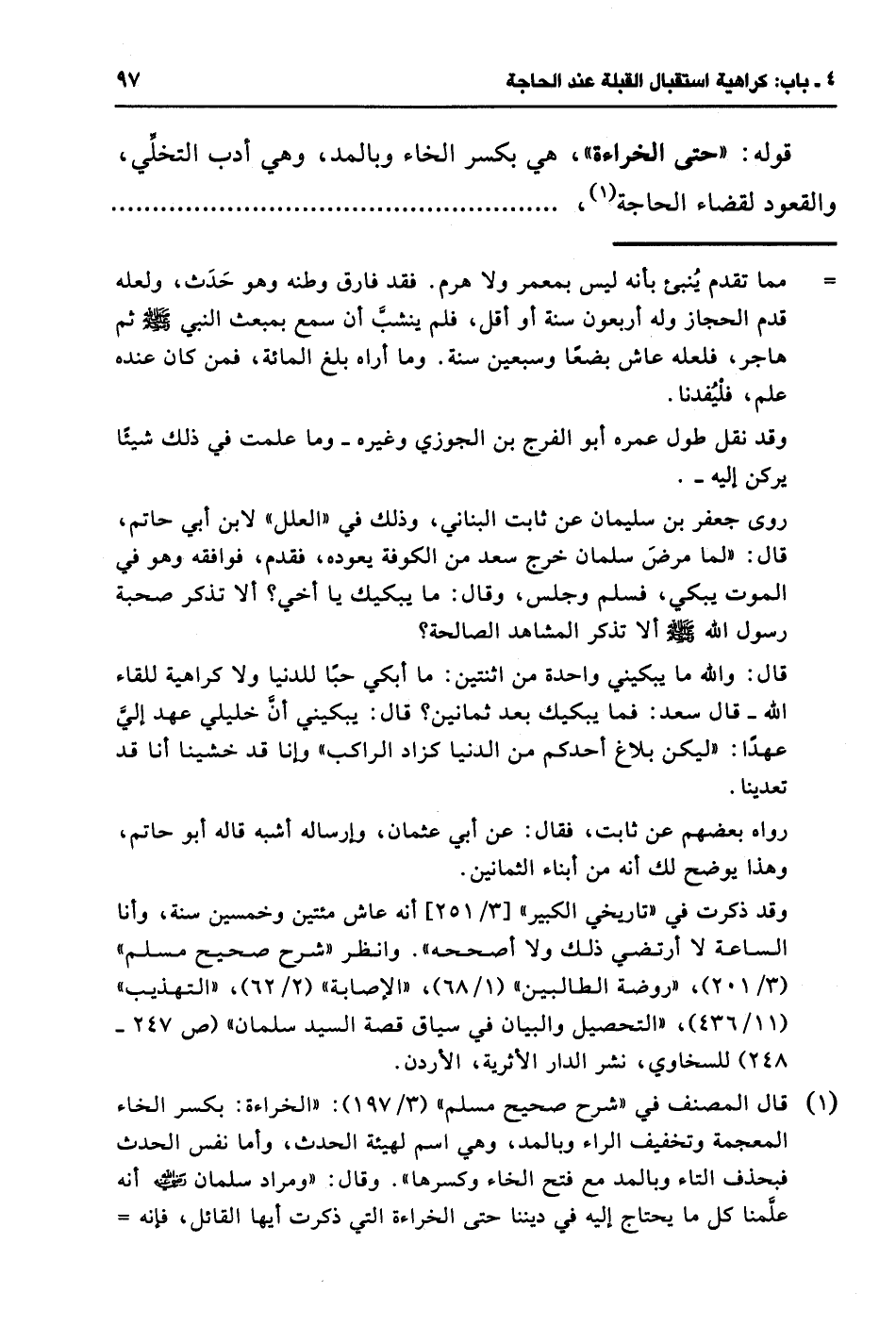 (¬1) قال المصنف في "شرح صحيح مسلم" (3/ 197): "الخراءة: بكسر الخاء المعجمة وتخفيف الراء وبالمد، وهي اسم لهيئة الحدث، وأما نفس الحدث فبحذف التاء وبالمد مع فتح الخاء وكسرها". وقال: "ومراد سلمان - صلى الله عليه وسلم - أنه علَّمنا كل ما يحتاج إليه في ديننا حتى الخراءة التي ذكرت أيها القائل، فإنه =