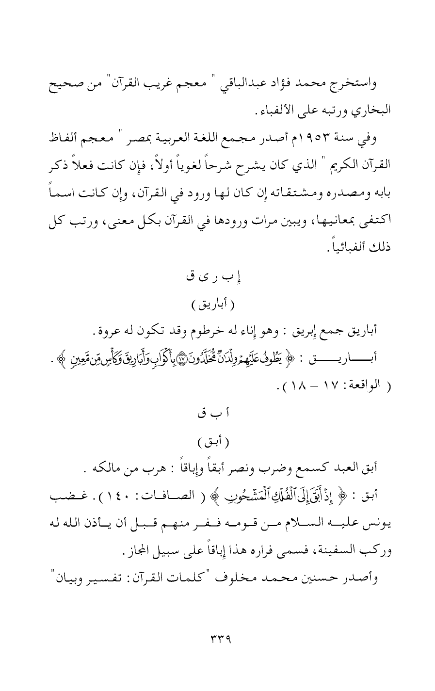 وصفوة القول في هذه الحركة: أنها الحركة العلمية الأولى في الإسلام، بدأت في عصر مبكر لا يعدو النصف الأول من القرن الأول للهجرة، ودونت بعد هذا التاريخ بقليل، وسارت في طريقين للانتظام: الترتيب وفقاً للسور في المصحف، وهو أقدمها، والترتيب الألفبائي. واستمرا في الوجود في حياة الحركة كلها. وكانت الألفاظ ترتب في داخل هذه السور بحسب ورودها في الآيات أيضاً. أما الترتيب الألفبائي، فابتدأ معقداً عند السجستاني في القرن الرابع من جهة، ومبسطاً من جهة أخرى، معقداً من حيث فصله بين المفتوح والمضموم والمكسور، ومبسطاً من حيث إدخاله الحروف الأصلية والمزيدة في اعتباره وكان من آثار هذا التعقيد أن لم يتبعه أحد من المؤلفين غير صاحبه، وأن الذين اعتمدوا على كتابه غيروا هذا الترتيب إلى الترتيب بحسب السور، مثل المارديني وابن الهائم. ولكن هذا الترتيب ارتقى سريعاً، فتخلص من كل تعقيداته وقيوده، ووصل إلى قمة الانتظام في القرن الخامس، على يد الراغب الأصفهاني، الذي اعتبر الحروف الأصلية وحدها ونظر إلى الألفاظ من أولها إلى آخرها، وقد غفل عن بعض آثار الضعف المتخلفة في ترتيبه في الثنائي والمضاعف والمعتل المهموز، ولكنها لا تشوه عمله لقلتها. ولم يرض من جاء بعد الراغب عن الحياة معه بين القمم، فعدل الرازي في القرن السابع عن ترتيبه، واصطنع ترتيب الجوهري، وجمع أبو حيان بين ترتيبي الراغب والجوهري، وأسقط الحشو، فكان ترتيبه غاية في التعقيد، ثم رجع العراقي في القرن التاسع إلى ترتيب الراغب.