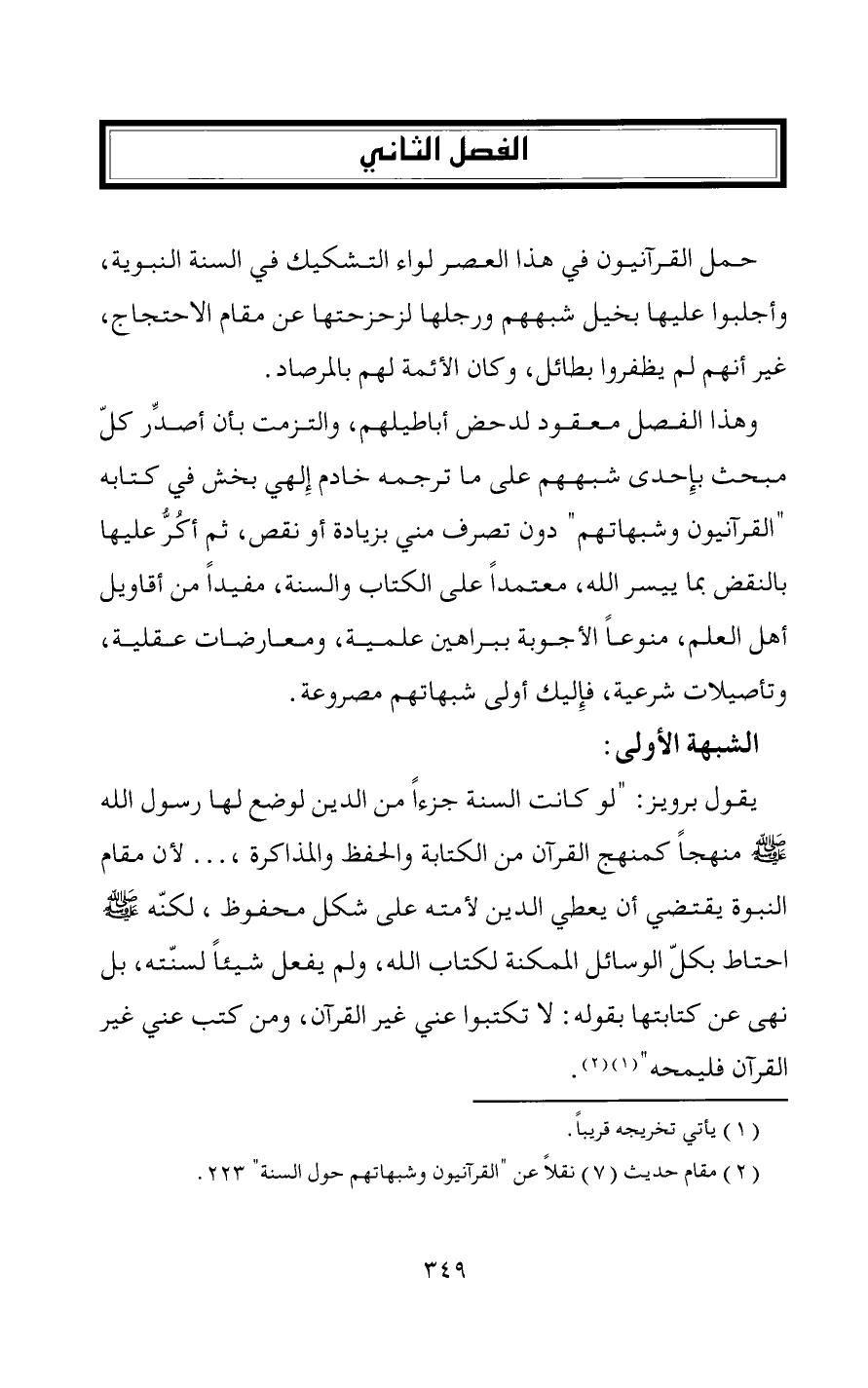 وليس منصوصا قطعا - فمن أين علمتم بوجود هذا المنهج، وقد رفضتم السنة وجعلتموها مختلقة مفتراة؟ فكيف تستدلون بسنة مختلقة مفتراة بزعمكم على أهمّ المطالب عندكم وهي ادعاء أن النبي صلى الله عليه وسلم وضع للقرآن منهجا في كتابته وحفظه ومذاكرته، ولم يعمل للسنة مثله.