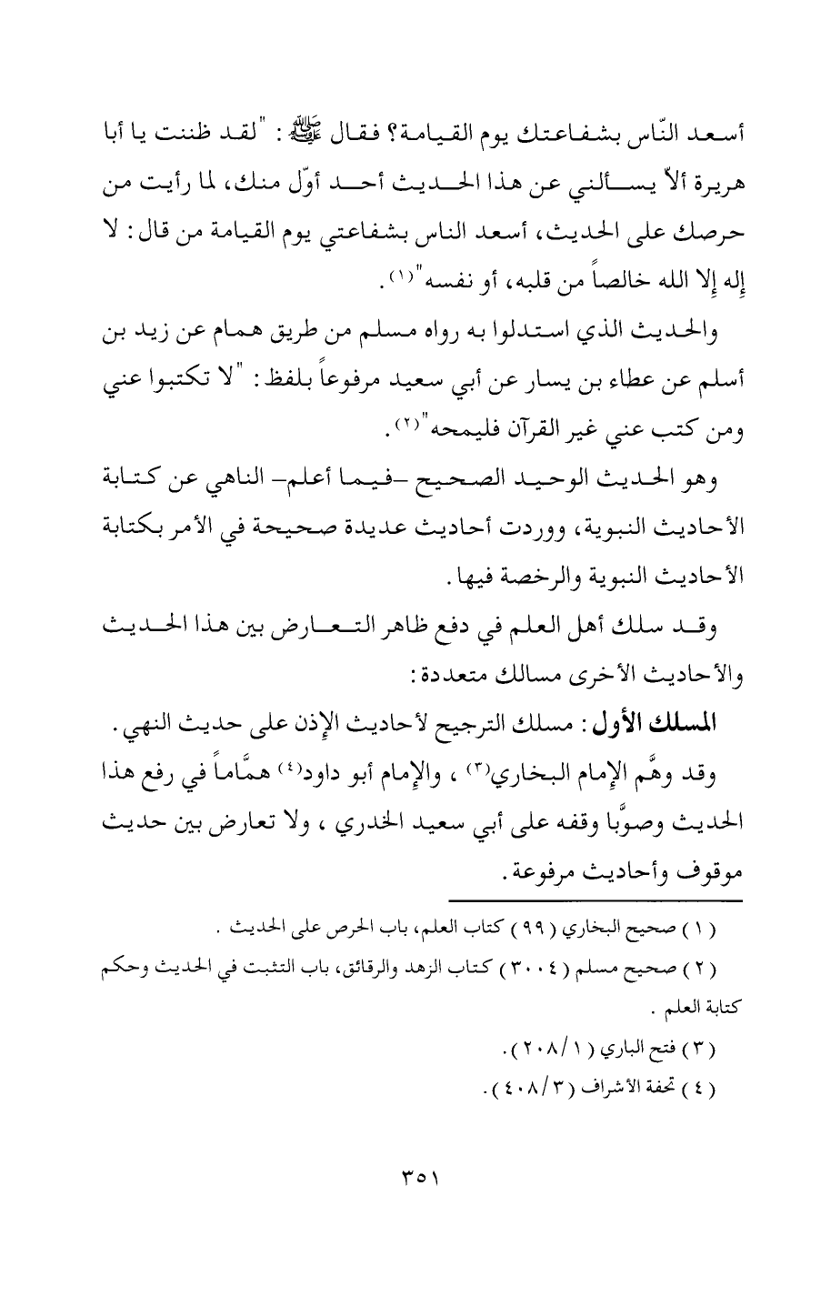 وذكر الزركشي وجوها أخرى في الجمع بينهما فقال: "أحدها: أن النهي عن الكتابة مخصوص بحياة سيد البشر النبي صلى الله عليه وسلم؛ لأن النسخ يطرأ في كل وقت فيختلط الناسخ بالمنسوخ، ويشهد له حديث أبي شاه لما أذن له في كتابة الخطبة التي خطب بها النبي صلى الله عليه وسلم.. الثاني: أن النهي لئلا يتكل الكاتب على ما يكتب ولا يحفظ فيقل الحفظ.. الثالث: ألا يتخذ مع القرآن كتابا يضاهى به" (2) .