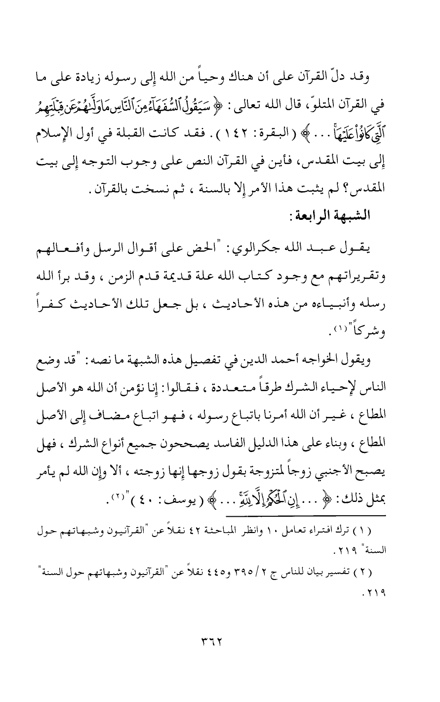 أَمْراً أَنْ يَكُونَ لَهُمُ الْخِيَرَةُ مِنْ أَمْرِهِمْ وَمَنْ يَعْصِ اللَّهَ وَرَسُولَهُ فَقَدْ ضَلَّ ضَلالاً مُبِيناً} (الآحزاب: 36) . وقال تعالى: {مَنْ يُطِعِ الرَّسُولَ فَقَدْ أَطَاعَ اللَّهَ} (النّساء:80) . وقال سبحانه: {وَمَا أَرْسَلْنَا مِنْ رَسُولٍ إِلَّا لِيُطَاعَ بِإِذْنِ اللَّهِ} (النّساء: 64) . فظهر من هذه الآيات أنّ القوم إنّما فيهم كيد الإسلام وكراهته، وجعله شيئاً آخر يوافق أهواءهم العليلة،