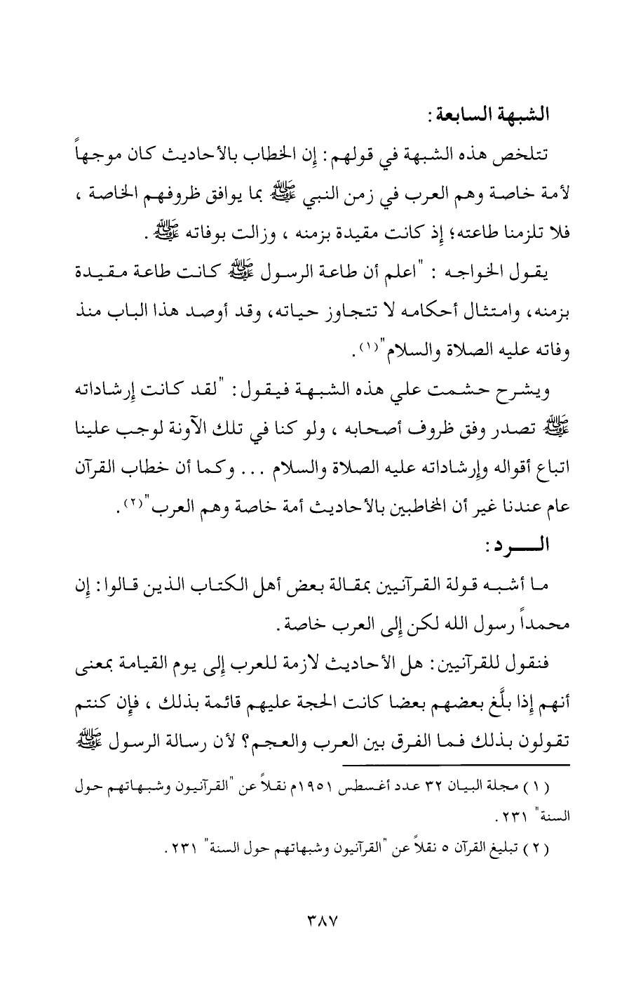 ويؤكد محب الحق هذا المعنى فيقول: "يجب نبذ تلك الأحاديث التي توصل الإسلام إلى بوتقة الهدف والاتهام؛ لأن نبي الإسلام بريء منها" (3) .