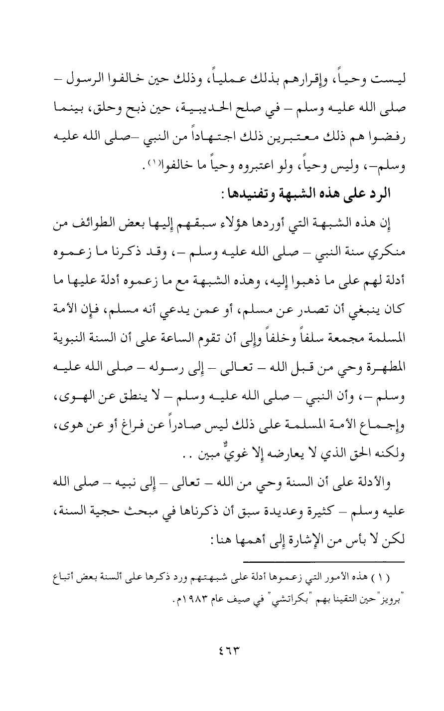 خلاصة هذه الشبهة قولهم: إن السنة لم تكن شرعاً عند النبي - صلى الله عليه وسلم-، ولم يقصد النبي - صلى الله عليه وسلم - أن تكون سنته مصدراً تشريعياً للدين، وما قال شيئاً أو فعله بقصد التشريع، ولم يرد النبي - صلى الله عليه وسلم - في حياته أن يكون ثمة مصدر تشريعي سوى القرآن المجيد. بل كان مصدر التشريع عند الرسول - صلى الله عليه وسلم - هو القرآن وحده، وكذلك فهم الصحابة - رضوان الله عليهم - وجاء عهد التابعين الذين بدأت فيه فتنة القول بالسنة، وأنها مصدر من مصادر التشريع، وكانت تلك قاصمة الظهر بالنسبة للدين، حيث دخل فيه ما ليس منه، واختلط بالوحي الصحيح الخالص الذي هو القرآن، ما ليس من الوحي بل هو كلام البشر، نعني بذلك سنة النبي.