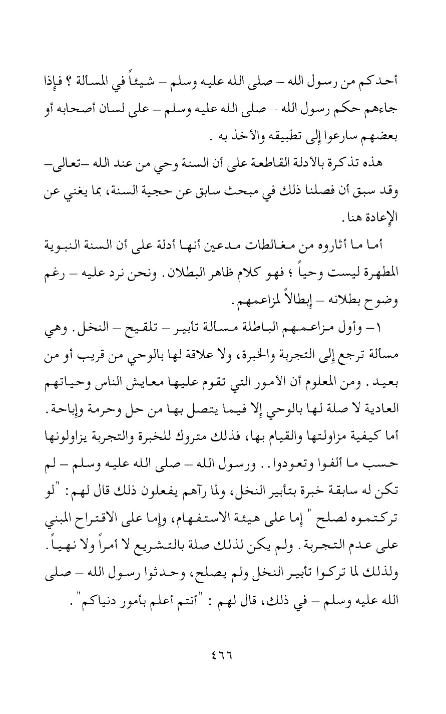 وأما احتجاجهم بأن الرسول - صلى الله عليه وسلم - نهى عن كتابة غير القرآن، وغير القرآن هو السنة. فهو احتجاج باطل من وجوه. أولها: أن هذا الحديث الذي رواه مسلم عن أبي سعيد الخدري، وهو قول الرسول - صلى الله عليه وسلم -: "لا تكتبوا عني، ومن كتب عني غير القرآن فليمحه". هذا الحديث معلول "أعله أمير المؤمنين في الحديث أبو عبد الله البخاري وغيره بالوقف على أبي سعيد. ولو صرفنا نظراً عن هذا، فإن رسول الله - صلى الله عليه وسلم - كما نهى عن الكتابة، فقد ورد عنه - صلى الله عليه وسلم - الإذن بها، بل الأمر بها في أحاديث أخر، ولذلك قلنا إن استدلالهم فيه تدليس، حيث ذكروا حديث النهي، ولم يشيروا إلى أحاديث الإذن وهي كثيرة. منها: أن رسول الله صلى الله عليه وسلم خطب يوم الفتح فقال "إن الله حبس عن مكة القتل - أو الفيل الشك من البخاري - وسلط عليهم رسول الله والمؤمنون...." ولما انتهى من خطبته جاء رجل من أهل اليمن فقال: اكتب لي يا رسول الله فقال رسول الله – صلى الله عليه وسلم: "اكتبوا لأبي شاة". (1) . ومنها: ما روي عن أبي هريرة - رضي الله عنه - أنه قال: "ما كان أحد أعلم بحديث رسول الله - صلى الله عليه وسلم - مني إلا عبد الله بن عمرو فقد كان يكتب ولا أكتب" (2) . ومن