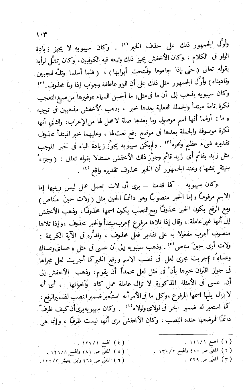 وأوَّل الجمهور ذلك على حذف الخبر1. وكان سيبويه لا يجيز زيادة الواو في الكلام، وكان الأخفش يجيز ذلك وتبعه فيه الكوفيون، وكان يمثل لرأيه بقوله تعالى: {حَتَّى إِذَا جَاءُوهَا وَفُتِحَتْ أَبْوَابُهَا} ، {فَلَمَّا أَسْلَمَا وَتَلَّهُ لِلْجَبِينِ، وَنَادَيْنَاهُ} , وأول الجمهور مثل ذلك على أن الواو عاطفة وجواب إذا ولما محذوف2. وكان سيبويه يذهب إلى أن ما في مثل: "ما أحسن السماء" وغيرها من صيغ التعجب نكرة تامة مبتدأ والجملة الفعلية بعدها خبر، وذهب الأخفش مذهبين في توجيه "ما"؛ أولهما: أنها اسم موصول وما بعدها صلة لا محل لها من الإعراب، والثاني: أنها نكرة موصوفة والجملة بعدها في موضع رفع نعت لها، وعليهما خبر المبتدأ محذوف تقديره: شيء عظيم ونحوه3. ولم يكن سيبويه يجوِّز زيادة الباء في الخبر الموجب مثل: زيد بقائم أي: زيد قائم, وجوَّز ذلك الأخفش مستدلا بقوله تعالى: "وجزاء سَيِّئَةٍ بمثلها", وعند الجمهور أن الخبر محذوف تقديره: واقع4.