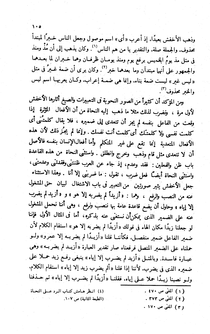ومن المؤكد أن كثيرا من الصور النحوية في التعبيرات والصيغ أثارها الأخفش لأول مرة، ونضرب لذلك مثلا ما ذهب إليه النحاة من أن الأفعال المؤثرة إذا وقعت من الفاعل بنفسه لم يجز أن تتعدى إلى ضميره، فلا يقال: كلمتُني أي: كلمت نفسي, ولا كلمتَك أي: كلمت أنت نفسك. وإنما لم يجز ذلك؛ لأن هذه الأفعال المتعدية إنما تقع على غير المتكلم, وأما أفعال الإنسان بنفسه فالأصل أن لا تتعدى مثل: قام وذهب وخرج وانطلق. واستثنى النحاة من هذه القاعدة باب ظن والفعلين: فقد وعدم، إذ جاء عن العرب: ظننتني وفقدتني وعدمتني، واستثنى النحاة أيضا الفعل ضرب، تقول: ما ضربني إلا أنا. وهذا الاستثناء جعل الأخفش يثير صورتين من التعبير في باب الاشتغال؛ لبيان حق المشغول عنه من النصب والرفع، وهما: "أزيدا لم يضربه إلا هو", و"أزيد لم يضرب إلا إياه" وحاول أن يضع قاعدة عامة بها ننصب ونرفع، وهي أننا نحمل المشغول عنه على الضمير الذي يمكن أن نستغني عنه بذكره، أما في المثال الأول فإننا لو جعلنا زيدا مكان الهاء في قولك: "أزيد لم يضربه إلا هو" استقام الكلام؛ لأن ضمير الفاعل ضمير منفصل، فكأننا قلنا: "أزيدا لم يضربه إلا عمرو" ولو حملناه على الضمير المتصل فرفعناه؛ صار تقدير العبارة: "أزيد لم يضربه" وهي عبارة فاسدة. وبالمثل "أزيد لم يضرب إلا إياه" ينبغي رفع زيد حملا على ضميره الذي في يضرب؛ لأننا إذا قلنا: "ألم يضرب زيد إلا إياه" استقام الكلام، ولو نصبنا زيدا حملا على إياه، فقلنا: "أزيدا لم يضرب إلا إياه" ثم حذفنا