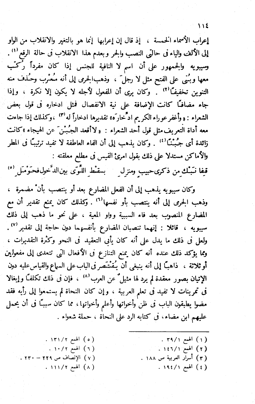 إعراب الأسماء الخمسة، إذ قال: إن إعرابها إنما هو بالتغير والانقلاب من الواو إلى الألف والياء في حالتي النصب والجر, وبعدم هذا الانقلاب في حالة الرفع1. وسيبويه والجمهور على أن اسم لا النافية للجنس إذا كان مفردا رُكب معها وبُني على الفتح مثل: لا رجلَ، وذهب الجرمي إلى أنه معرب وحذف منه التنوين تخفيفا2. وكان يرى أن المفعول لأجله لا يكون إلا نكرة، وإذا جاء مضافا كانت الإضافة على نية الانفصال, فمثل ادخاره في قول بعض الشعراء: