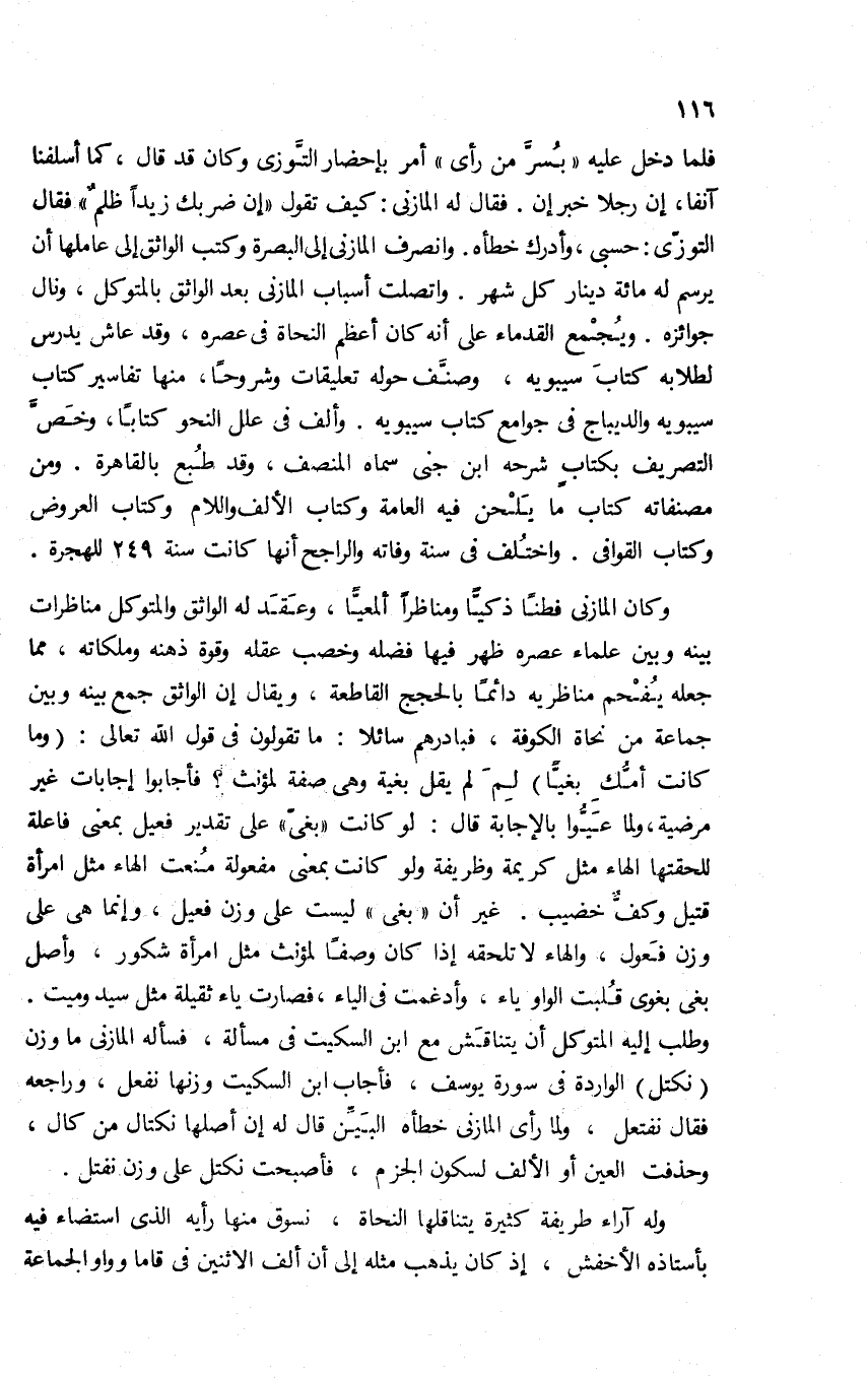 فلما دخل عليه "بسر من رأى" أمر بإحضار التوزي وكان قد قال، كما أسلفنا آنفا: إن رجلا خبر إن. فقال له المازني: كيف تقول: "إن ضربك زيدا ظلم"؟ فقال التوزي: حسبي، وأدرك خطأه. وانصرف المازني إلى البصرة وكتب الواثق إلى عاملها أن يرسم له مائة دينار كل شهر. واتصلت أسباب المازني بعد الواثق بالمتوكل، ونال جوائزه. ويُجْمع القدماء على أنه كان أعظم النحاة في عصره، وقد عاش يدرس لطلابه كتاب سيبويه، وصنَّف حوله تعليقات وشروحا، منها: تفاسير كتاب سيبويه والديباج في جوامع كتاب سيبويه. وألف في علل النحو كتابا، وخص التصريف بكتاب شرحه ابن جني سماه المنصف، وقد طبع بالقاهرة. ومن مصنفاته كتاب ما يَلحن فيه العامة وكتاب الألف واللام وكتاب العروض وكتاب القوافي. واختُلف في سنة وفاته, والراجح أنها كانت سنة 249 للهجرة.