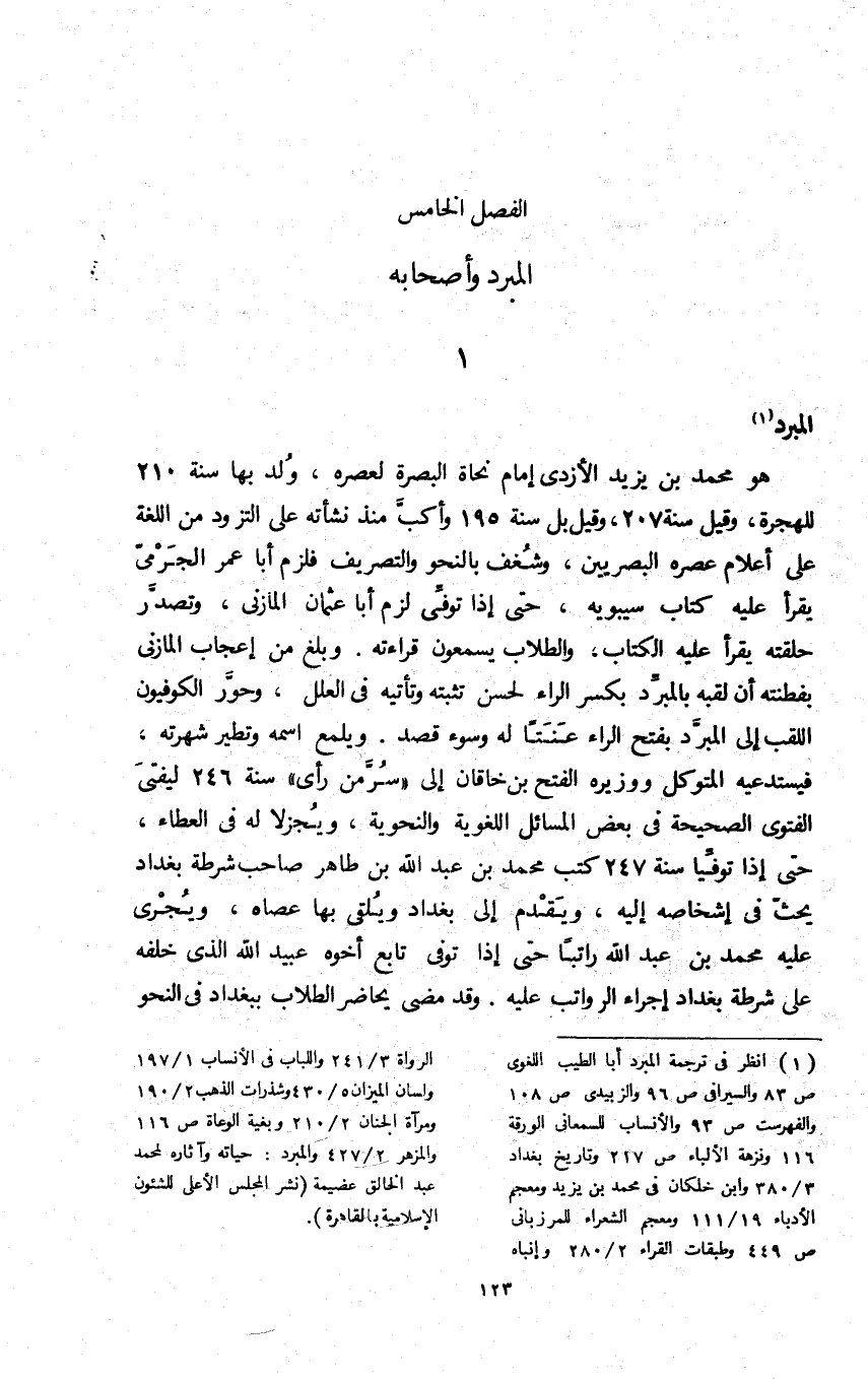 1 انظر في ترجمة المبرد: أبا الطيب اللغوي ص83, والسيرافي ص96, والزبيدي ص108, والفهرست ص93, والأنساب للسمعاني الورقة 116, ونزهة الألباء ص217, وتاريخ بغداد 3/ 380, وابن خلكان في محمد بن يزيد, ومعجم الأدباء 19/ 111, ومعجم الشعراء للمرزباني ص449, وطبقات القراء 2/ 280, وإنباه الرواة 3/ 241, واللباب في الأنساب 1/ 197, ولسان الميزان 5/ 430, وشذرات الذهب 2/ 190, ومرآة الجنان 2/ 210, وبغية الوعاة ص116, والمزهر 2/ 427, والمبرد: حياته وآثاره لمحمد عبد الخالق عضيمة "نشر المجلس الأعلى للشئون الإسلامية بالقاهرة".
