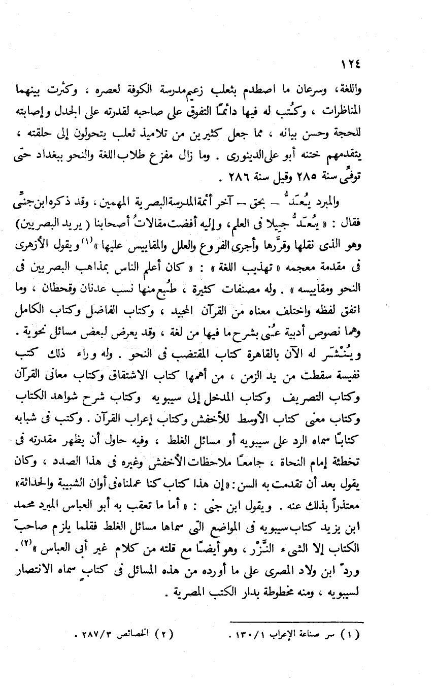 واللغة، وسرعان ما اصطدم بثعلب زعيم مدرسة الكوفة لعصره، وكثرت بينهما المناظرات، وكتب له فيها دائما التفوق على صاحبه؛ لقدرته على الجدل وإصابته للحجة وحسن بيانه، مما جعل كثيرين من تلاميذ ثعلب يتحولون إلى حَلْقته، يتقدمهم ختنه أبو علي الدينوري. وما زال مفزع طلاب اللغة والنحو ببغداد, حتى توفي سنة 285 وقيل: سنة 286.