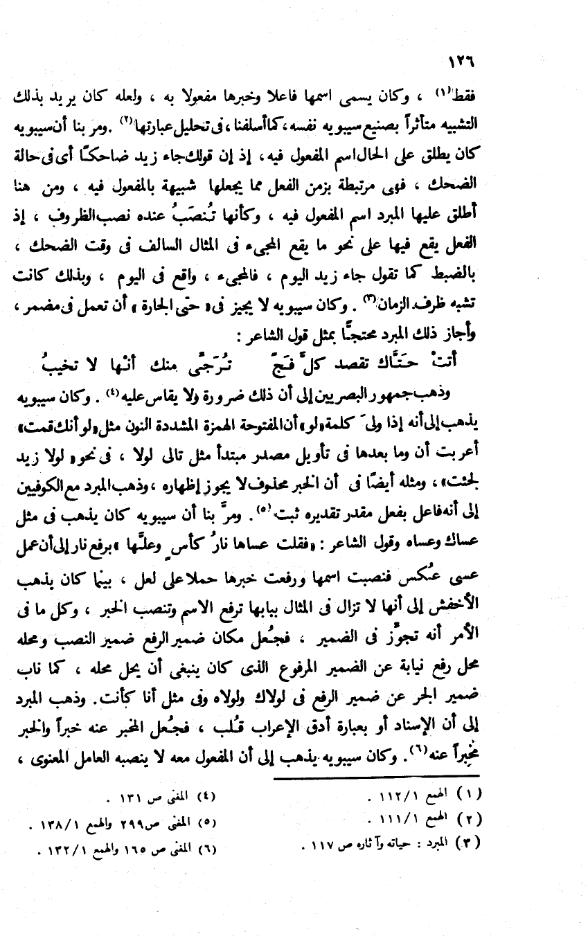 فقط1، وكان يسمي اسمها فاعلا وخبرها مفعولا به، ولعله كان يريد بذلك التشبيه متأثرا بصنيع سيبويه نفسه، كما أسلفنا، في تحليل عبارتها2. ومر بنا أن سيبويه كان يطلق على الحال اسم المفعول فيه، إذ إن قولك: جاء زيد ضاحكًا أي: في حالة الضحك، فهي مرتبطة بزمن الفعل مما يجعلها شبيهة بالمفعول فيه، ومن هنا أطلق عليها المبرد اسم المفعول فيه، وكأنها تنصب عنده نصب الظروف، إذ الفعل يقع فيها على نحو ما يقع المجيء في المثال السالف في وقت الضحك، بالضبط كما تقول: جاء زيد اليوم، فالمجيء واقع في اليوم، وبذلك كانت تشبه ظرف الزمان3. وكان سيبويه لا يجيز في "حتى الجارة" أن تعمل في مضمر، وأجاز ذلك المبرد محتجا بمثل قول الشاعر: