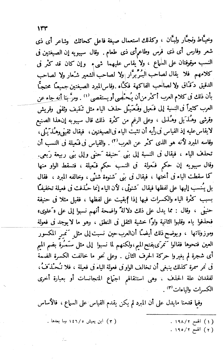 وخيّاط ونجّار ولبّان، وكذلك استعمال صيغة فاعل كحائك وشاعر أي: ذي شعر وفارس أي: ذي فرس وطاعم أي: ذي طعام. وقال سيبويه: إن الصيغتين في النسب موقوفتان على السماع، ولا يقاس عليهما شيء وإن كان قد كثر في كلامهم فلا يقال لصاحب البر: برّار ولا لصاحب الشعير: شعّار ولا لصاحب الدقيق: دقّاق ولا لصاحب الفاكهة: فكّاه. وقاس المبرد الصيغتين جميعا محتجا بأن ذلك في كلام العرب أكثر من أن يحصى أو يستقصى1. ومر بنا أنه جاء عن العرب كثيرا في النسبة إلى فَعِيل وفُعَيْل حذف الياء مثل: ثقيف وثقفي, وقريش وقرشي, وهذيل وهذلي، وعلى الرغم من كثرة ذلك قال سيبويه: إن هذا الصنيع لا يقاس عليه؛ إذ القياس في رأيه أن تثبت الياء في الصيغتين، فيقال: ثقيفي وهذيلي، وقاسه المرد لأنه هو الذي كثر عن العرب2. والقياس في فَعيلة في النسب أن تحذف الياء، فيقال في النسبة إلى بني حنيفة: حنفي, وإلى بني ربيعة: ربعي. وقال سيبويه: إن حكم فَعولة في النسب حكم فَعِيلة، فتسقط الواو منها كما سقطت الياء في أختها، فيقال في بني شَنُوءة: شنئي، وخالفه المبرد، فقال: بل ينسب إليها على لفظها فيقال: شئوني؛ لأن الياء إنما حُذفت في فعيلة تخفيفا بسبب كثرة الياء والكسرات فيها إذا أُبقيت على لفظها، فقيل مثلا في حنيفة: حنيفي، وقال: مما يدل على ذلك دلالة واضحة أنهم نسبوا إلى علي: "علوي" فحذفوا ياء وقلبوا الثانية واوا خشية الثقل في النطق، وهو ما لا يوجد في فعولة وموزوناتها، ويوضح ذلك أيضا أن العرب حين نسبت إلى مثل نَمِر المكسور العين فتحوها فقالوا: نَمَري بفتح الميم، ولكنهم لما نسبوا إلى مثل سَمُرة بضم الميم أي: شجرة لم يغيروا حركة الحرف الثاني. وعلى نحو ما خالفت الكسرة الضمة في نمر وسمرة, كذلك ينبغي أن تخالف الواو في فعولة الياء في فعيلة، فلا تحذف؛ لفقدان علة الحذف، وهي استثقالهم اجتماع المتجانسات, أو بعبارة أخرى: الكسرات والياءات3.