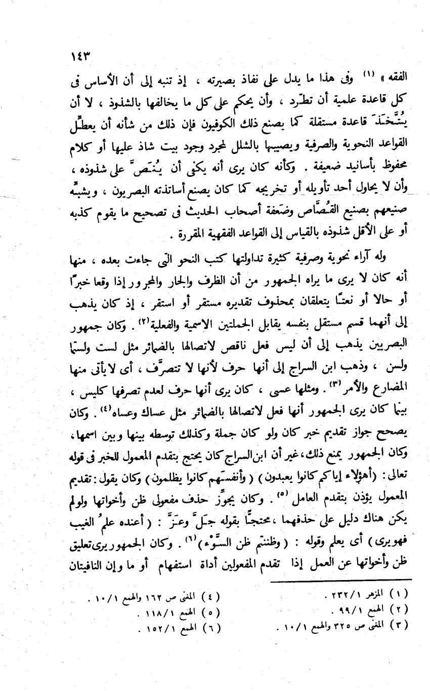 الفقه"1. وفي هذا ما يدل على نفاذ بصيرته، إذ تنبه إلى أن الأساس في كل قاعدة علمية أن تطرد، وأن يحكم على كل ما يخالفها بالشذوذ، لا أن يُتخذ قاعدة مستقلة كما يصنع ذلك الكوفيون, فإن ذلك من شأنه أن يعطل القواعد النحوية والصرفية ويصيبها بالشلل لمجرد وجود بيت شاذ عليها أو كلام محفوظ بأسانيد ضعيفة. وكأنه كان يرى أنه يكفي أن ينص على شذوذه، وأن لا يحاول أحد تأويله أو تخريجه كما كان يصنع أساتذته البصريون، ويشبه صنيعهم بصنيع القصاص وضعفة أصحاب الحديث في تصحيح ما يقوم كذبه, أو على الأقل شذوذه بالقياس إلى القواعد الفقهية المقررة.
