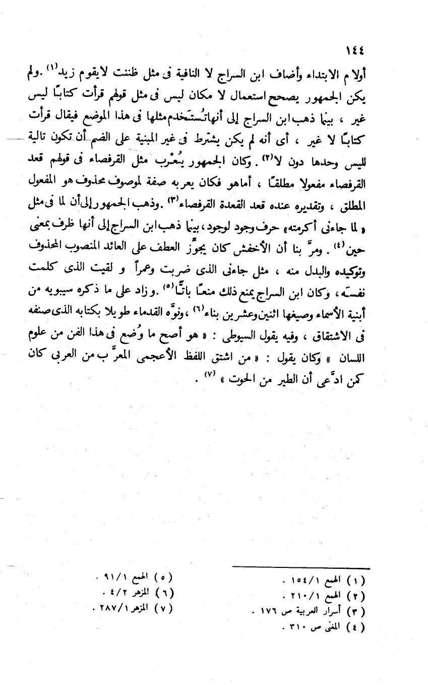 أو لام الابتداء, وأضاف ابن السراج لا النافية في مثل: ظننت لا يقوم زيد1. ولم يكن الجمهور يصحح استعمال لا مكان ليس في مثل قولهم: قرأت كتابا ليس غير، بينما ذهب ابن السراج إلى أنها تستخدم مثلها في هذا الموضع, فيقال: قرأت كتابا لا غير، أي: إنه لم يكن يشترط في غير المبنية على الضم أن تكون تالية لليس وحدها دون لا2. وكان الجمهور يعرب مثل القرفصاء في قولهم: قعد القرفصاء مفعولا مطلقا، أما هو فكان يعربه صفة لموصوف محذوف هو المفعول المطلق، وتقديره: عنده قعد القعدة القرفصاء3. وذهب الجمهور إلى أن لما في مثل: "لما جاءني أكرمته" حرف وجود لوجود، بينما ذهب ابن السراج إلى أنها ظرف بمعنى حين4. ومر بنا أن الأخفش كان يجوز العطف على العائد المنصوب المحذوف وتوكيده والبدل منه، مثل: جاءني الذي ضربت وعمرا, ولقيت الذي كلمت نفسه، وكان ابن السراج يمنع ذلك منعا باتا5. وزاد على ما ذكره سيبويه من أبنية الأسماء وصيغها اثنين وعشرين بناء6، ونوه القدماء طويلا بكتابه الذي صنفه في الاشتقاق، وفيه يقول السيوطي: "هو أصح ما وُضع في هذا الفن من علوم اللسان", وكان يقول: "من اشتق اللفظ الأعجمي المعرب من العربي, كان كمن ادعى أن الطير من الحوت"7.