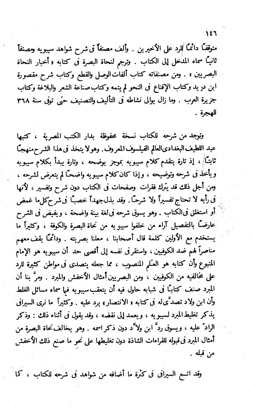 متوقفا دائما للرد على الأخيرين. وألف مصنفا في شرح شواهد سيبويه ومصنفا ثانيا سماه المدخل إلى الكتاب. وترجم لنحاة البصرة في كتابه "أخبار النحاة البصريين". ومن مصنفاته كتاب ألفات الوصل والقطع وكتاب شرح مقصورة ابن دريد وكتاب الإقناع في النحو لم يتمه وكتاب صناعة الشعر والبلاغة وكتاب جزيرة العرب. وما زال يوالي نشاطه في التأليف والتصنيف, حتى توفي سنة 368 للهجرة.