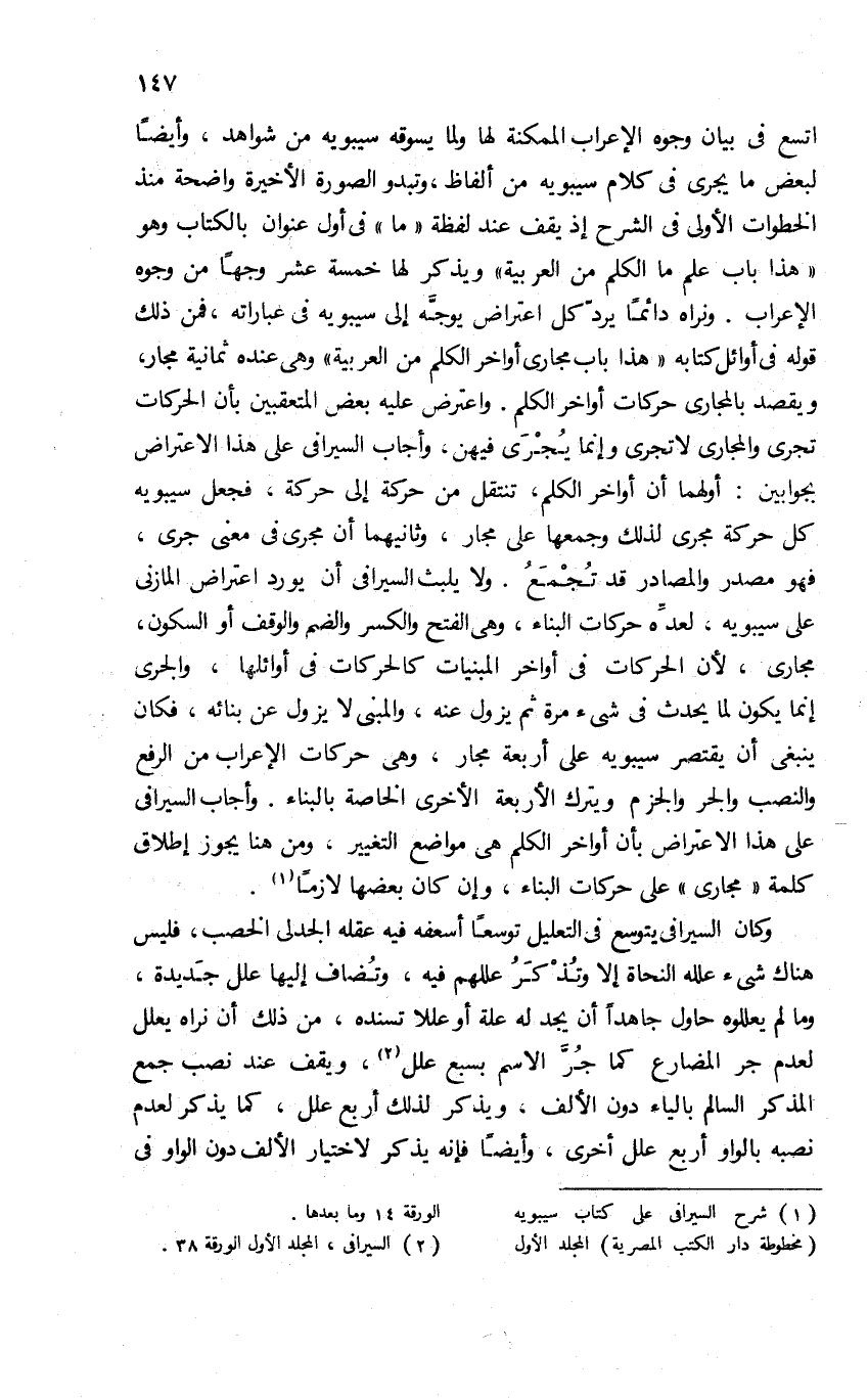 1 شرح السيرافي على كتاب سيبويه "مخطوطة دار الكتب المصرية" المجلد الأول الورقة 14 وما بعدها.