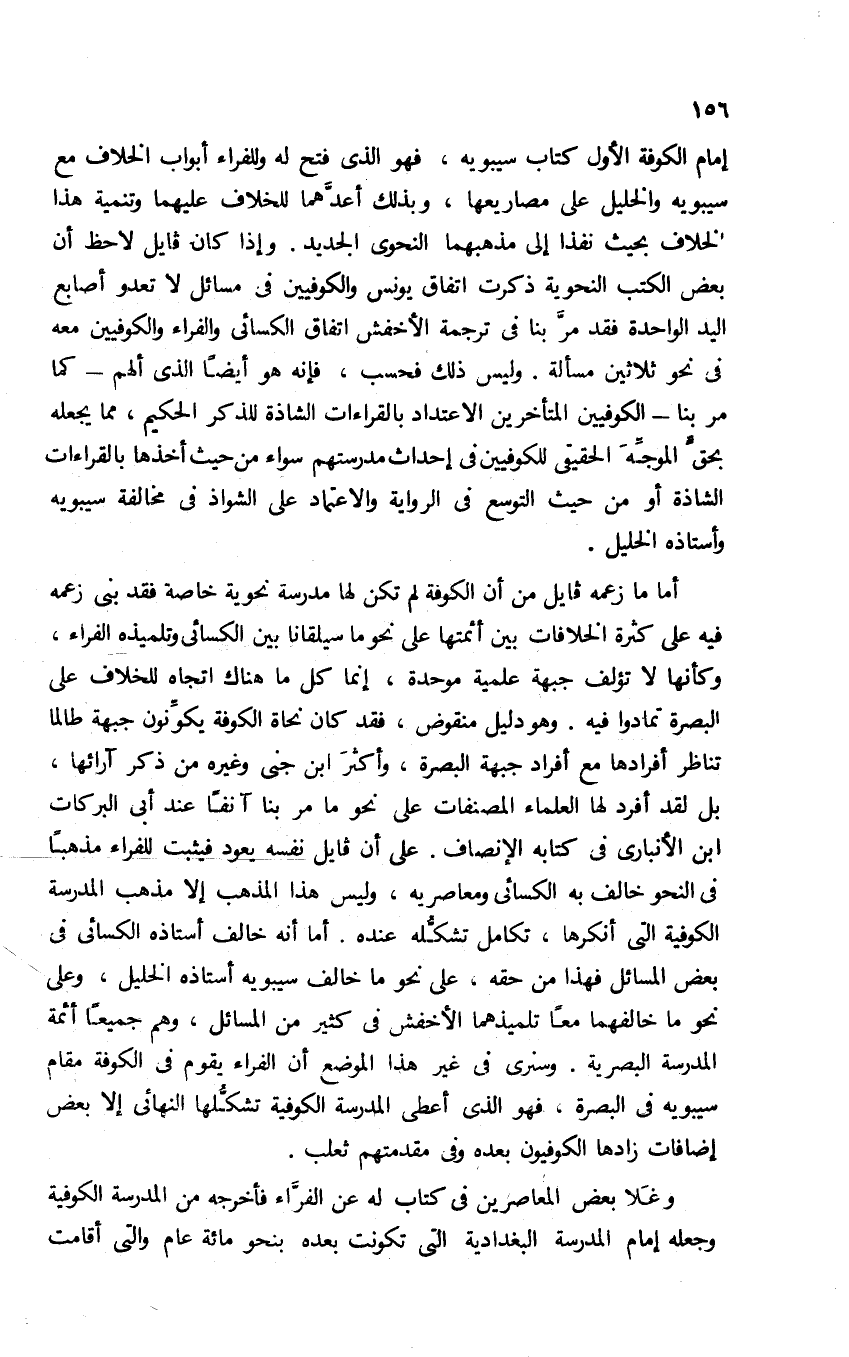 أما ما زعمه فايل من أن الكوفة لم تكن لها مدرسة نحوية خاصة, فقد بنى زعمه فيه على كثرة الخلافات بين أئمتها على نحو ما سيلقانا بين الكسائي وتلميذه الفراء، وكأنها لا تؤلف جبهة علمية موحدة، إنما كل ما هناك اتجاه للخلاف على البصرة تمادوا فيه. وهو دليل منقوض، فقد كان نحاة الكوفة يكونون جبهة طالما تناظر أفرادها مع أفراد جبهة البصرة، وأكثر ابن جني وغيره من ذكر آرائها، بل لقد أفرد لها العلماء المصنفات على نحو ما مر بنا آنفا عند أبي البركات بن الأنباري في كتابه الإنصاف. على أن فايل نفسه يعود فيثبت للفراء مذهبا في النحو خالف به الكسائي ومعاصريه، وليس هذا المذهب إلا مذهب المدرسة الكوفية التي أنكرها، تكامل تشكله عنده. أما أنه خالف أستاذه الكسائي في بعض المسائل فهذا من حقه، على نحو ما خالف سيبويه أستاذه الخليل، وعلى نحو ما خالفهما معا تلميذهما الأخفش في كثير من المسائل، وهم جميعا أئمة المدرسة البصرية. وسنرى في غير هذا الموضع أن الفراء يقوم في الكوفة مقام سيبويه في البصرة، فهو الذي أعطى المدرسة الكوفية تشكلها النهائي إلا بعض إضافات زادها الكوفيون بعده وفي مقدمتهم ثعلب.