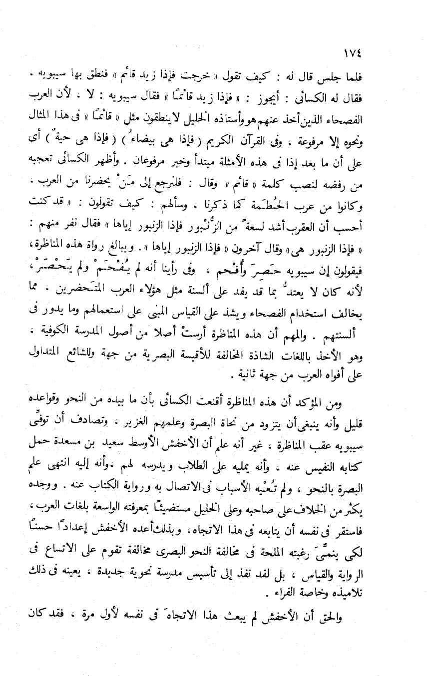 فلما جلس قال له: كيف تقول: "خرجت, فإذا زيد قائم"؟ فنطق بها سيبويه، فقال له الكسائي: أيجوز: "فإذا زيد قائما"؟ فقال سيبويه: لا؛ لأن العرب الفصحاء الذين أخذ عنهم هو وأستاذه الخليل لا ينطقون مثل "قائما" في هذا المثال ونحوه إلا مرفوعة، وفي القرآن الكريم: {فَإِذَا هِيَ بَيْضَاءُ} , {فَإِذَا هِيَ حَيَّةٌ} أي: على أن ما بعد إذا في هذه الأمثلة مبتدأ وخبر مرفوعان. وأظهر الكسائي تعجبه من رفضه لنصب كلمة "قائم", وقال: فلنرجع إلى من يحضرنا من العرب، وكانوا من عرب الحطمة كما ذكرنا، وسألهم: كيف تقولون: "قد كنت أحسب أن العقرب أشد لسعة من الزنبور, فإذا الزنبور إياها"؟ فقال نفر منهم: "فإذا الزنبور هي", وقال آخرون: "فإذا الزنبور إياها". ويبالغ رواة هذه المناظرة، فيقولون: إن سيبويه حصر وأفحم، وفي رأينا أنه لم يفحم ولم يحصر، لأنه كان لا يعتد بما قد يفد على ألسنة مثل هؤلاء العرب المتحضرين، مما يخالف استخدام الفصحاء ويشذ على القياس المبني على استعمالهم وما يدور في ألسنتهم. والمهم أن هذه المناظرة أرست أصلا من أصول المدرسة الكوفية، وهو الأخذ باللغات الشاذة المخالفة للأقيسة البصرية من جهة وللشائع المتداول على أفواه العرب من جهة ثانية.