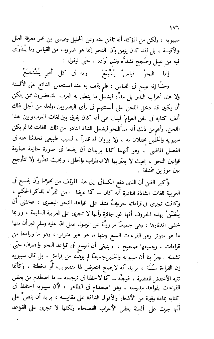 وأكبر الظن أن الذي دفع الكسائي إلى هذا الموقف من نحوهما, وأن يفسح في العربية للغات الشاذة النادرة أنه كان -كما عرفنا- من القراء للذكر الحكيم، وكانت تجري في قراءاته حروف تشذ على قواعد النحو البصري، فخشي أن يظن بهذه الحروف أنها غير جائزة, وأنها لا تجري على العربية السليمة، وربما خشي اندثارها، وهي جميعا مروية عن الرسول -صلى الله عليه وسلم- غير أن منها ما هو متواتر وهو القراءات السبع, ومنها ما هو غير متواتر، وهو ما وراءها من قراءات، وجميعها صحيح، وينبغي أن نتوسع في قواعد النحو والصرف حتى تشمله. ومر بنا أن سيبويه والخليل جميعا لم يوهنا من قراءة، بل قال سيبويه: إن القراءة سنة، يريد أنه لا يصح التعرض لها بتصويب أو تخطئة، وكأنما تنبه الأخفش للقضية، فوجه -كما لاحظنا في ترجمته- ما اصطدم من بعض القراءات بقواعد مدرسته، وهو اصطدام في الظاهر؛ لأن سيبويه احتفظ في كتابه بمادة وفيرة من الأشعار والأقوال الشاذة على مقاييسه، يريد أن ينص على أنها جرت على ألسنة بعض الأعراب الفصحاء ولكنها لا تجري على القواعد