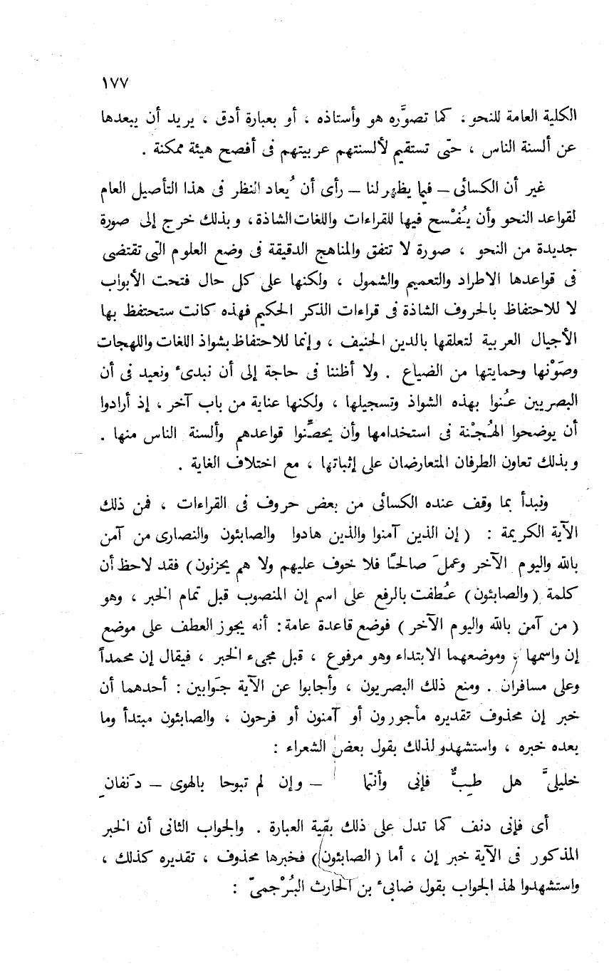 غير أن الكسائي -فيما يظهر لنا- رأى أن يعاد النظر في هذا التأصيل العام لقواعد النحو, وأن يفسح فيها للقراءات واللغات الشاذة، وبذلك خرج إلى صورة جديدة من النحو، صورة لا تتفق والمناهج الدقيقة في وضع العلوم التي تقتضي في قواعدها الاطراد والتعميم والشمول، ولكنها على كل حال فتحت الأبواب لا للاحتفاظ بالحروف الشاذة في قراءات الذكر الحكيم, فهذه كانت ستحتفظ بها الأجيال العربية لتعلقها بالدين الحنيف، وإنما للاحتفاظ بشواذ اللغات واللهجات وصونها وحمايتها من الضياع. ولا أظننا في حاجة إلى أن نبدئ ونعيد في أن البصريين عُنوا بهذه الشواذ وتسجيلها، ولكنها عناية من باب آخر، إذ أرادوا أن يوضحوا الهجنة في استخدامها وأن يحصنوا قواعدهم وألسنة الناس منها, وبذلك تعاون الطرفان المتعارضان على إثباتها، مع اختلاف الغاية.