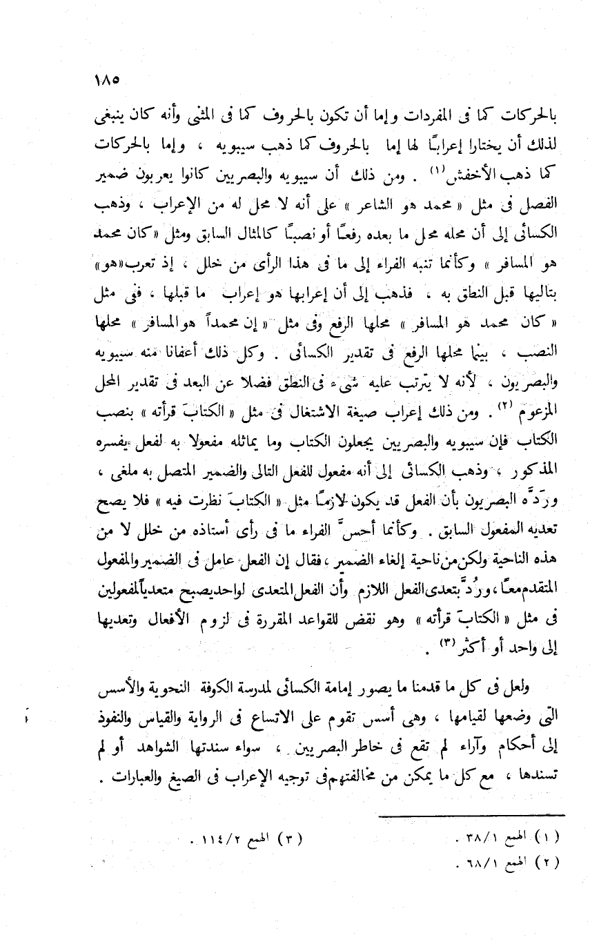 بالحركات كما في المفردات, وإما أن تكون بالحروف كما في المثنى وأنه كان ينبغي لذلك أن يختارا إعرابا لها, إما بالحروف كما ذهب سيبويه، وإما بالحركات كما ذهب الأخفش1. ومن ذلك أن سيبويه والبصريين كانوا يعربون ضمير الفصل في مثل: "محمد هو الشاعر" على أنه لا محل له من الإعراب، وذهب الكسائي إلى أن محله محل ما بعده رفعا أو نصبا كالمثال السابق, ومثل: "كان محمد هو المسافر" وكأنما تنبه الفراء إلى ما في هذا الرأي من خلل، إذ تعرب "هو" بتاليها قبل النطق به، فذهب إلى أن إعرابها هو إعراب ما قبلها، ففي مثل: "كان محمد هو المسافر" محلها الرفع, وفي مثل: "إن محمدا هو المسافر" محلها النصب، بينما محلها الرفع في تقدير الكسائي. وكل ذلك أعفانا منه سيبويه والبصريون؛ لأنه لا يترتب عليه شيء في النطق فضلا عن البعد في تقدير المحل المزعوم2. ومن ذلك إعراب صيغة الاشتغال في مثل: "الكتابَ قرته" بنصب الكتاب, فإن سيبويه والبصريين يجعلون الكتاب وما يماثله مفعولا به لفعل يفسره المذكور، وذهب الكسائي إلى أنه مفعول للفعل التالي والضمير المتصل به ملغى، ورده البصريون بأن الفعل قد يكون لازما مثل: "الكتابَ نظرت فيه" فلا يصح تعديه المفعول السابق. وكأنما أحسّ الفراء ما في رأي أستاذه من خلل لا من هذه الناحية, ولكن من ناحية إلغاء الضمير، فقال: إن الفعل عامل في الضمير والمفعول المتقدم معا، ورُد بتعدي الفعل اللازم وأن الفعل المتعدي لواحد يصبح متعديا لمفعولين في مثل: "الكتابَ قرأته" وهو نقض للقواعد المقررة في لزوم الأفعال وتعديها إلى واحد أو أكثر3.