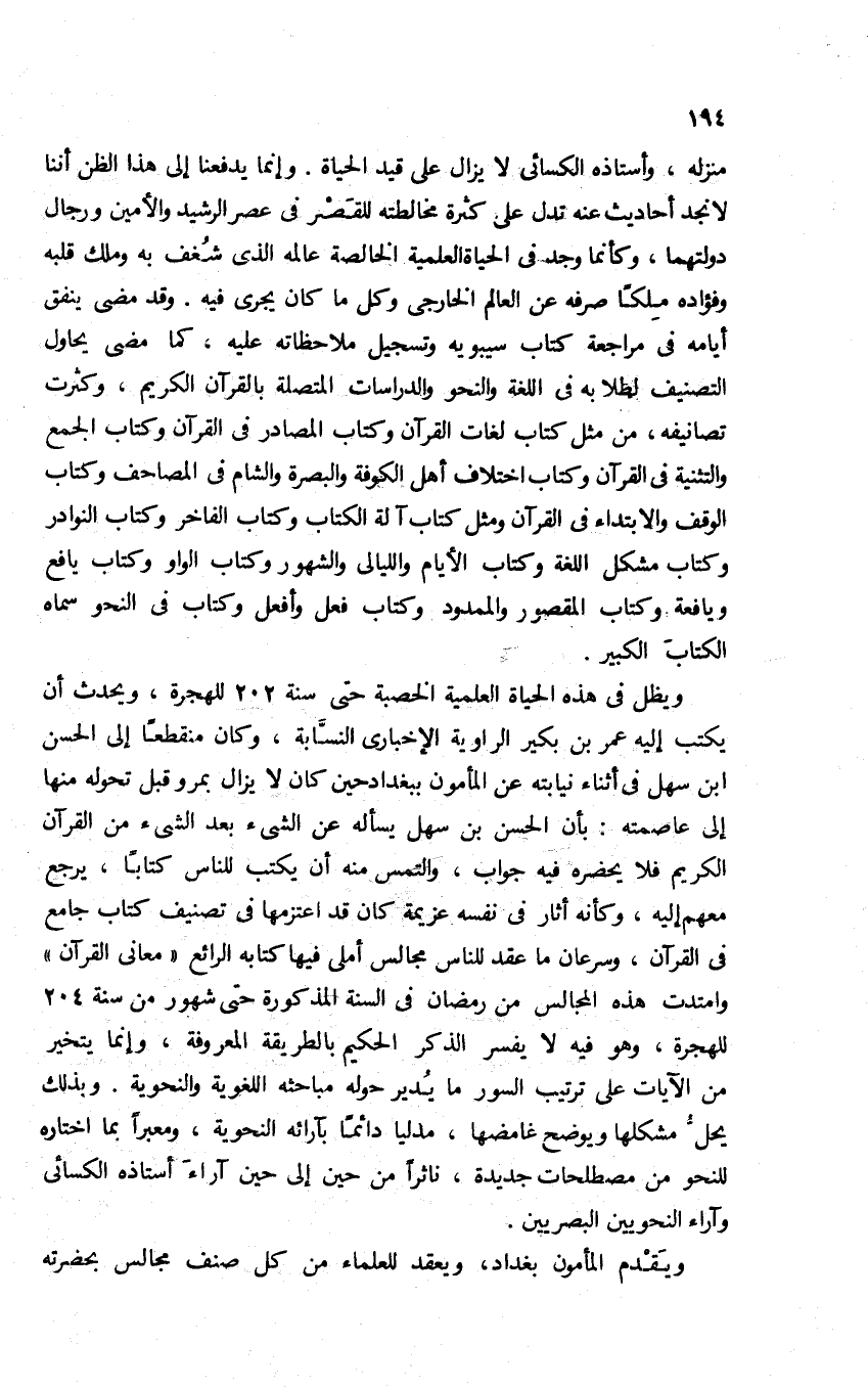 منزله، وأستاذه الكسائي لا يزال على قيد الحياة. وإنما يدفعنا إلى هذا الظن أننا لا نجد أحاديث عنه تدل على كثرة مخالطته للقصر في عصر الرشيد والأمين ورجال دولتهما، وكأنما وجد في الحياة العلمية الخالصة عالمه الذي شغف به وملك قلبه وفؤاده ملكا صرفه عن العالم الخارجي وكل ما كان يجري فيه. وقد مضى ينفق أيامه في مراجعة كتاب سيبويه وتسجيل ملاحظاته عليه, كما مضى يحاول التصنيف لطلابه في اللغة والنحو والدراسات المتصلة بالقرآن الكريم، وكثرت تصانيفه، من مثل كتاب لغات القرآن وكتاب المصادر في القرآن وكتاب الجمع والتثنية في القرآن وكتاب اختلاف أهل الكوفة والبصرة والشام في المصاحف وكتاب الوقف والابتداء في القرآن, ومثل كتاب آلة الكتاب وكتاب الفاخر وكتاب النوادر وكتاب مشكل اللغة وكتاب الأيام والليالي والشهور وكتاب الواو وكتاب يافع ويافعة وكتاب المقصور والممدود وكتاب فعل وأفعل وكتاب في النحو سماه الكتاب الكبير.