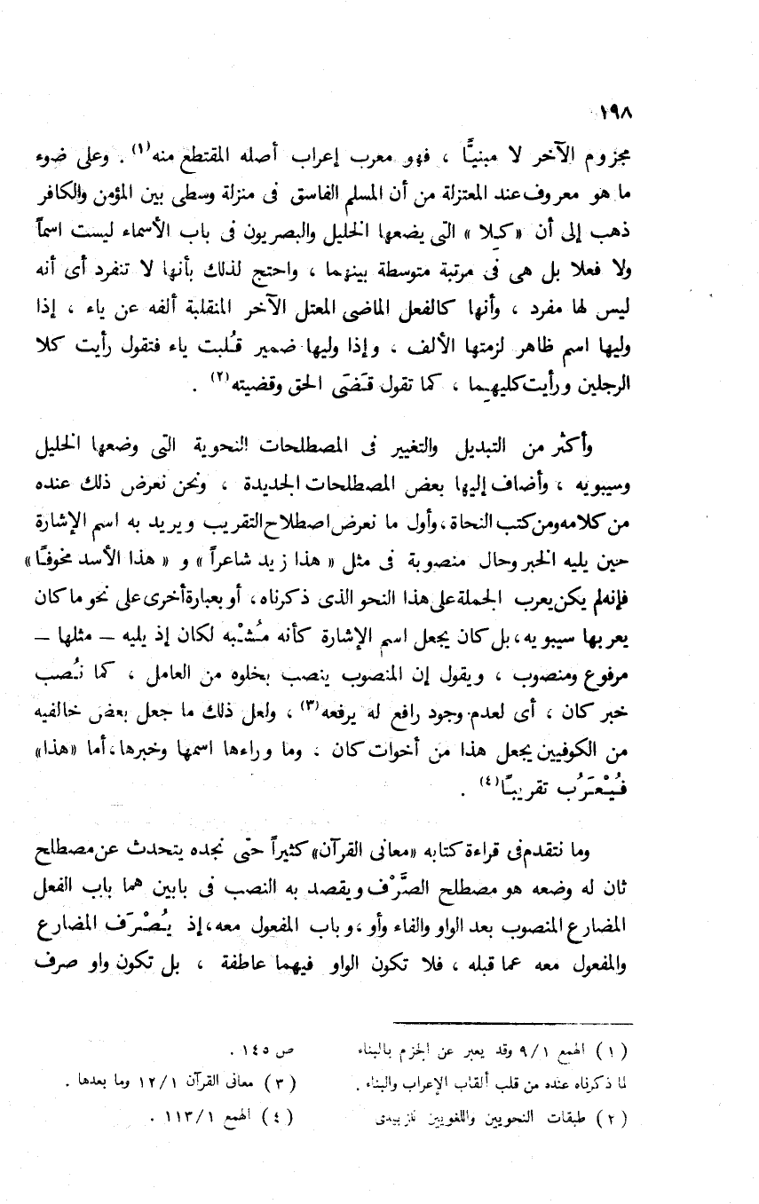 مجزوم الآخر لا مبنيا، فهو معرب إعراب أصله المقتطع منه1. وعلى ضوء ما هو معروف عند المعتزلة من أن المسلم الفاسق في منزلة وسطى بين المؤمن والكافر, ذهب إلى أن "كِلا" التي يضعها الخليل والبصريون في باب الأسماء ليست اسما ولا فعلا, بل هي في مرتبة متوسطة بينهما، واحتج لذلك بأنها لا تنفرد أي: إنه ليس لها مفرد، وأنها كالفعل الماضي المعتل الآخر المنقلبة ألفه عن ياء، إذا وليها اسم ظاهر لزمتها الألف، وإذا وليها ضمير قُلبت ياء فتقول: رأيت كلا الرجلين ورأيت كليهما، كما تقول: قضى الحق وقضيته2.
