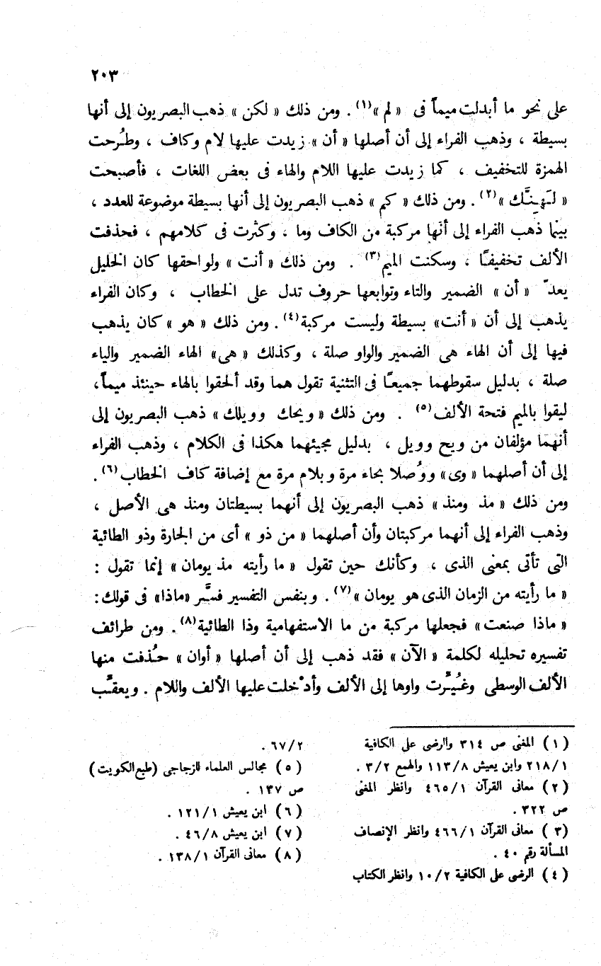 على نحو ما أبدلت ميما في "لم"1. ومن ذلك "لكن" ذهب البصريون إلى أنها بسيطة، وذهب الفراء إلى أن أصلها "أن" زِيدت عليها لام وكاف، وطُرحت الهمزة للتخفيف، كما زيدت عليها اللام والهاء في بعض اللغات، فأصبحت "لَهِنَّك"2. ومن ذلك" كم" ذهب البصريون إلى أنها بسيطة موضوعة للعدد، بينما ذهب الفراء إلى أنها مركبة من الكاف وما، وكثرت في كلامهم، فحذفت الألف تخفيفا، وسكنت الميم3. ومن ذلك "أنت" ولواحقها كان الخليل يعد "أن" الضمير والتاء وتوابعها حروف تدل على الخطاب، وكان الفراء يذهب إلى أن "أنت" بسيطة وليست مركبة4. ومن ذلك "هو" كان يذهب فيها إلى أن الهاء هي الضمير والواو صلة، وكذلك "هي" الهاء الضمير والياء صلة، بدليل سقوطهما جميعا في التثنية تقول: هما وقد ألحقوا بالهاء حينئذ ميما؛ ليقوا بالميم فتحة الألف5. ومن ذلك "ويحك وويلك" ذهب البصريون إلى أنهما مؤلفان من ويح وويل، بدليل مجيئهما هكذا في الكلام، وذهب الفراء إلى أن أصلهما "وي" ووُصلا بحاء مرة وبلام مرة مع إضافة كاف الخطاب6. ومن ذلك "مذ ومنذ" ذهب البصريون إلى أنهما بسيطتان ومنذ هي الأصل، وذهب الفراء إلى أنهما مركبتان وأن أصلهما "من ذو" أي: من الجارة وذو الطائية التي تأتي بمعنى الذي، وكأنك حين تقول: "ما رأيته مذ يومان" إنما تقول: "ما رأيته من الزمان الذي هو يومان"7. وبنفس التفسير فسر "ماذا" في قولك: "ماذا صنعت؟ " فجعلها مركبة من ما الاستفهامية وذا الطائية8. ومن طرائف تفسيره, تحليله لكلمة "الآن" فقد ذهب إلى أن أصلها "أوان" حذفت منها الألف الوسطى وغُيِّرت واوها إلى الألف وأدخلت عليها الألف واللام. ويعقب