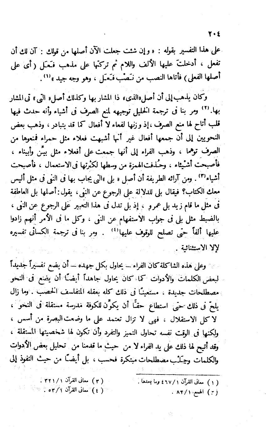 وكان يذهب إلى أن أصل "الذي" ذا المشار بها وكذلك أصل "التي" تي المشار بها2. ومر بنا في ترجمة الخليل توجيهه لمنع الصرف في أشياء, وأنه حدث فيها قلب أتاح لها منع الصرف، إذ وزنها لفعاء لا أفعال كما قد يتبادر، وذهب بعض النحويين إلى أن جمعها أفعال غير أنها أشبهت فعلاء مثل حمراء, فمنعوها من الصرف توهما، وذهب الفراء إلى أنها جمعت على أفعلاء مثل بيِّن وأبيناء، فأصبحت أشيئاء، وحذفت الهمزة من وسطها لكثرتها في الاستعمال، فأصبحت أشياء3. ومن آرائه الطريفة أن أصل "بلى" التي يُجاب بها في النفي في مثل: أليس معك الكتاب؟ فيقال: بلى للدلالة على الرجوع عن النفي، يقول: أصلها: بل العاطفة في مثل: ما قام زيد بل عمرو، إذ بل تدل في هذا التعبير على الرجوع عن النفي، بالضبط مثل بلى في جواب الاستفهام عن النفي، وكل ما في الأمر أنهم زادوا عليها ألفا حتى تصلح للوقوف عليها4. ومر بنا في ترجمة الكسائي تفسيره لإلا الاستثنائية.