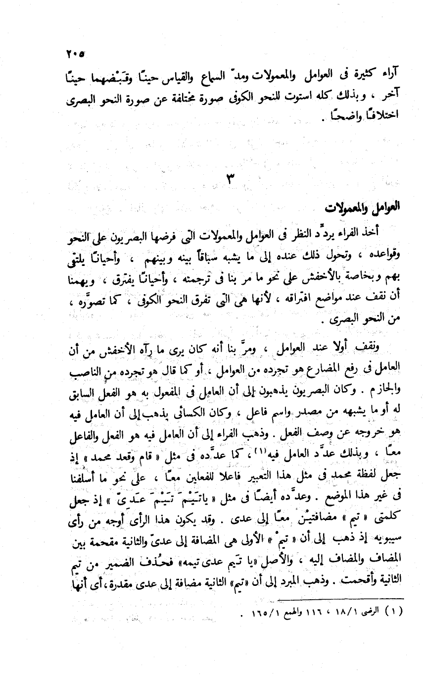 ونقف أولا عند العوامل، ومر بنا أنه كان يرى ما رآه الأخفش من أن العامل في رفع المضارع هو تجرده من العوامل، أو كما قال: هو تجرده من الناصب والجازم. وكان البصريون يذهبون إلى أن العامل في المفعول به هو الفعل السابق له أو ما يشبهه من مصدر واسم فاعل، وكان الكسائي يذهب إلى أن العامل فيه هو خروجه عن وصف الفعل. وذهب الفراء إلى أن العامل فيه هو الفعل والفاعل معا، وبذلك عدَّد العامل فيه1، كما عدَّده في مثل: "قام وقعد محمد" إذ جعل لفظة محمد في مثل هذا التعبير فاعلا للفعلين معا، على نحو ما أسلفنا في غير هذا الموضع. وعدده أيضا في مثل: "يا تيمَ تيمَ عدي" إذ جعل كلمتي "تيم" مضافتين معا إلى عدي. وقد يكون هذا الرأي أوجه من رأي سيبويه, إذ ذهب إلى أن "تيم" الأولى هي المضافة إلى عدي والثانية مقحمة بين المضاف والمضاف إليه، والأصل "يا تيم عدي تيمه", فحُذف الضمير من تيم الثانية وأقحمت. وذهب المبرد إلى أن "تيم" الثانية مضافة إلى عدي مقدرة، أي: إنها