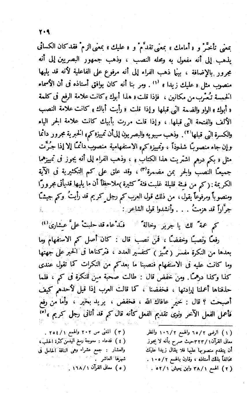 بمعنى تأخر, و"أمامك" بمعنى تقدم, و"عليك" بمعنى الزم, فقد كان الكسائي يذهب إلى أنه مفعول به ومحله النصب، وذهب جمهور البصريين إلى أنه مجرور بالإضافة، بينما ذهب الفراء إلى أنه مرفوع على الفاعلية؛ لأنه قد يليها منصوب مثل: "عليك زيدا"1. ومر بنا أنه كان يوافق أستاذه في أن الأسماء الخمسة تعرب من مكانين، فإذا قلت: "هذا أبوك" كانت علامة الرفع في كلمة "أبوك" الواو والضمة التي قبلها, وإذا قلت: "رأيت أباك" كانت علامة النصب الألف والفتحة التي قبلها، وإذا قلت: مررت بأبيك, كانت علامة الجر الياء والكسرة التي قبلها2. وذهب سيبويه والبصريون إلى أن تمييز "كم" الخبرية مجرور دائما وإن جاء منصوبا شذوذا، وتمييز "كم" الاستفهامية منصوب دائما إلا إذا جُرت مثل: "بكم درهم اشتريت هذا الكتاب؟ "، وذهب الفراء إلى أنه يجوز في تمييزها جميعا النصب والجر بمن مضمرة3، وقد علق على كم التكثيرية في الآية الكريمة: {كَمْ مِنْ فِئَةٍ قَلِيلَةٍ غَلَبَتْ فِئَةً كَثِيرَةً} ملاحظا أن ما يليها قد يأتي مجرورا ومنصوبا ومرفوعا, يقول: "من ذلك قول العرب: كم رجلٍ كريم قد رأيت! وكم جيشا جرارا قد هزمت! وأنشدوا قول الشاعر: