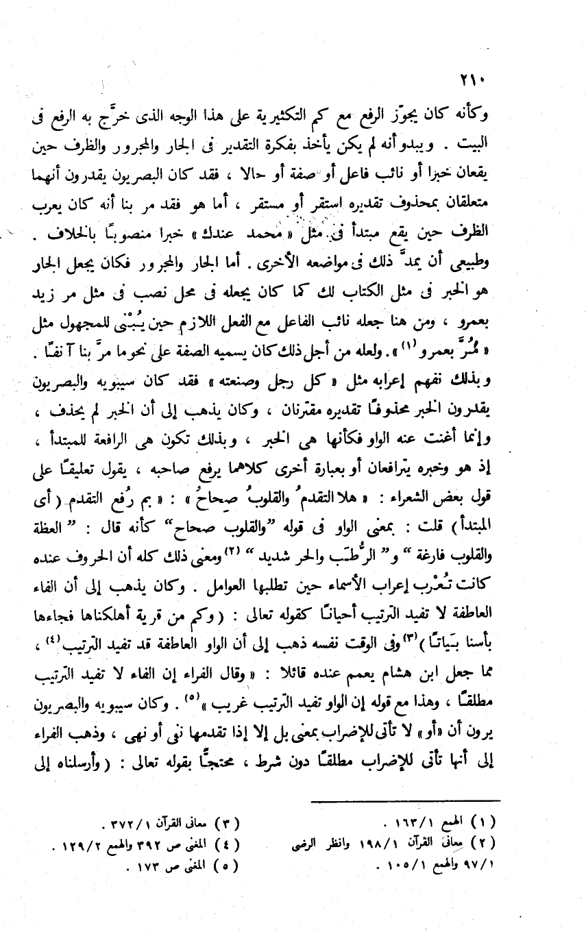 بم رُفع التقدم "أي: المبتدأ"؟ قلت: بمعنى الواو في قوله: "والقلوب صحاح", كأنه قال: "العظة القلوب فارغة" و"الرطب والحر شديد"2, ومعنى ذلك كله أن الحروف عنده كانت تعرب إعراب الأسماء حين تطلبها العوامل. وكان يذهب إلى أن الفاء العاطفة لا تفيد الترتيب أحيانا كقوله تعالى: {وَكَمْ مِنْ قَرْيَةٍ أَهْلَكْنَاهَا فَجَاءَهَا بَأْسُنَا بَيَاتًا} 3 وفي الوقت نفسه ذهب إلى أن الواو العاطفة قد تفيد الترتيب4، مما جعل ابن هشام يعمم عنده قائلا: "وقال الفراء: إن الفاء لا تفيد الترتيب مطلقا، وهذا مع قوله: إن الواو تفيد الترتيب غريب"5. وكان سيبويه والبصريون يرون أن "أو" لا تأتي للإضراب بمعنى بل إلا إذا تقدمها نفي أو نهي، وذهب الفراء إلى أنها تأتي للإضراب مطلقا دون شرط, محتجا بقوله تعالى: {وَأَرْسَلْنَاهُ إِلَى