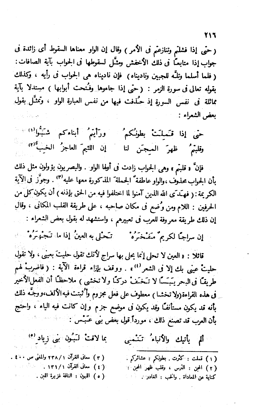 قائلا: "العين لا تحلى, إنما يحلى بها سراج؛ لأنك تقول: حليتَ بعيني، ولا تقول: حليت عيني بك إلا في الشعر"4. ووقف بإزاء قراءة الآية: "فاضرب لهم طريقا في البحر يبسا لَا تَخَفْ دركا ولا تخشى" ملاحظا أن الفعل الأخير في هذه القراءة: "ولا تخشى" معطوف على فعل مجزوم وأثبتت فيه الألف، ووجه ذلك بأنه قد يكون مستأنفا وقد يكون في موضع جزم وإن كانت فيه الياء, واحتج بأن العرب قد تصنع ذلك، موردا قول بعض بني عبس: