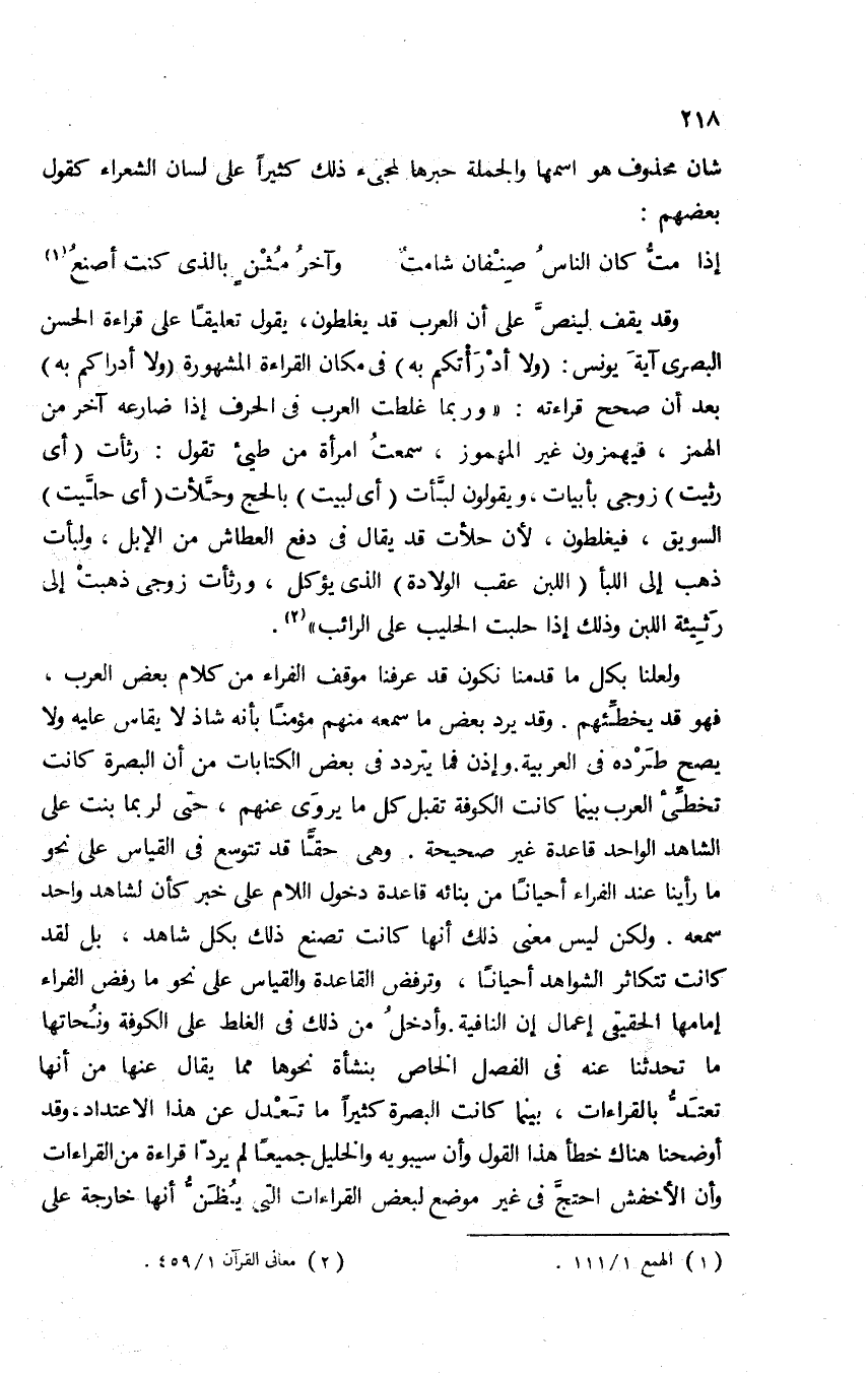وقد يقف لينص على أن العرب قد يغلطون، يقول تعليقا على قراءة الحسن البصري آية يونس: "وَلَا أَدْرَأْتُكُمْ بِهِ" في مكان القراءة المشهورة: {وَلَا أَدْرَاكُمْ بِهِ} بعد أن صحح قراءته: "وربما غلطت العرب في الحرف إذا ضارعه آخر من الهمز، فيهمزون غير المهموز، سمعتُ امرأة من طيئ تقول: رثأت "أي: رثيت" زوجي بأبيات، ويقولون: لبَّأت "أي: لبيت" بالحج, وحلأت "أي: حليت" السويق، فيغلطون؛ لأن حلأت قد يقال في دفع العطاش من الإبل، ولبأت: ذهب إلى اللبأ "اللبن عقب الولادة" الذي يؤكل، ورثأت زوجي: ذهبت إلى رَثِيئة اللبن, وذلك إذا حلبت الحليب على الرائب"2.
