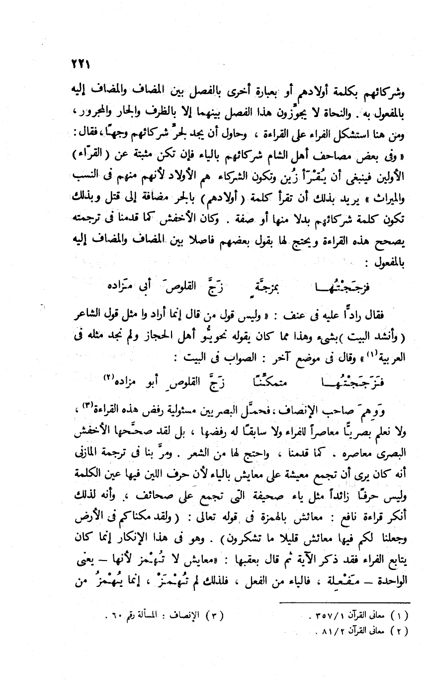 ووهم صاحب الإنصاف، فحمّل البصريين مسئولية رفض هذه القراءة3، ولا نعلم بصريا معاصرا للفراء ولا سابقا له رفضها، بل لقد صححها الأخفش البصري معاصره كما قدمنا، واحتج لها من الشعر. ومر بنا في ترجمة المازني أنه كان يرى أن تجمع معيشة على معايش بالياء؛ لأن حرف اللين فيها عين الكلمة وليس حرفا زائدا مثل ياء صحيفة التي تجمع على صحائف، وأنه لذلك أنكر قراءة نافع: "معائش" بالهمزة في قوله تعالى: "ولقد مكناكُمْ فِي الأرْضِ وَجعلنَا لَكم فِيهَا مَعَائِشَ قَلِيلا مَا تشكرون". وهو في هذا الإنكار إنما كان يتابع الفراء فقد ذكر الآية ثم قال بعقبها: "معايش لا تهمز؛ لأنها -يعني الواحدة- مَفْعِلة، فالياء من الفعل، فلذلك لم تهمز، إنما يهمز من