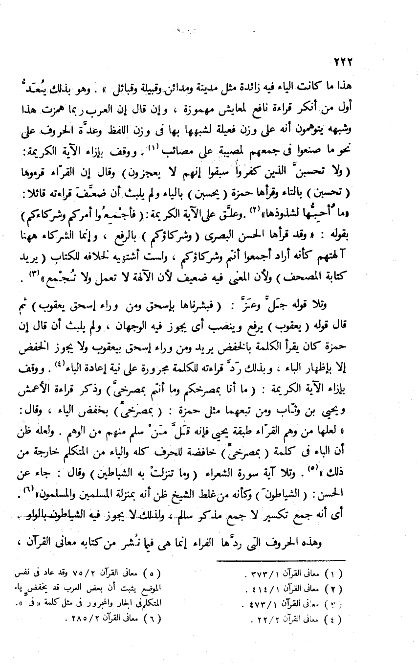 هذا ما كانت الياء فيه زائدة مثل: مدينة ومدائن وقبيلة وقبائل". وهو بذلك يعد أول من أنكر قراءة نافع لمعايش مهموزة، وإن قال العرب: ربما همزت هذا وشبهه يتوهمون أنه على وزن فعيلة لشبهها بها في وزن اللفظ وعدة الحروف على نحو ما صنعوا في جمعهم لمصيبة على مصائب1. ووقف بإزاء الآية الكريمة: "وَلَا تَحْسَبَنَّ الَّذِينَ كفروا سبقوا إِنهم لا يعجزون" وقال: إن القراء قرءوها "تحسبن" بالتاء وقرأها حمزة: {يَحْسَبَنَّ} بالياء ولم يلبث أن ضعف قراءته قائلا: "ما أُحبها لشذوذها"2. وعلق على الآية الكريمة: {فَأَجْمِعُوا أَمْرَكُمْ وَشُرَكَاءَكُمْ} بقوله: "وقد قرأها الحسن البصري: "وَشُرَكَاؤُكُمْ" بالرفع، وإنما الشركاء ههنا آلهتهم, كأنه أراد: أجمعوا أنتم وشركاؤكم، ولست أشتهيه لخلافه للكتاب "يريد: كتابة المصحف" ولأن المعنى فيه ضعيف؛ لأن الآلهة لا تعمل ولا تجمع"3.