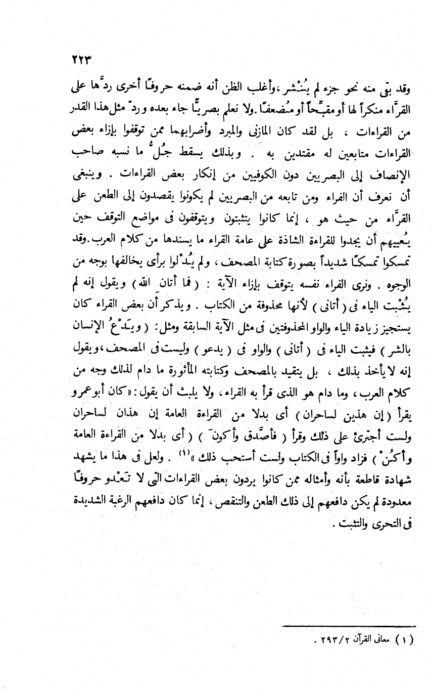 وقد بقي منه نحو جزء لم ينشر، وأغلب الظن أنه ضمنه حروفا أخرى ردها على القراء منكرا لها, أو مقبحا, أو مضعفا. ولا نعلم بصريا جاء بعده ورد مثل هذا القدر من القراءات، بل لقد كان المازني والمبرد وأضرابهما ممن توقفوا بإزاء بعض القراءات متابعين له, مقتدين به. وبذلك يسقط جل ما نسبه صاحب الإنصاف إلى البصريين دون الكوفيين من إنكار بعض القراءات. وينبغي أن نعرف أن الفراء ومن تابعه من البصريين لم يكونوا يقصدون إلى الطعن على القراء من حيث هو، إنما كانوا يتثبتون ويتوقفون في مواضع التوقف حين يُعييهم أن يجدوا للقراءة الشاذة على عامة القراء ما يسندها من كلام العرب. وقد تمسكوا تمسكا شديدا بصورة كتابة المصحف، ولم يدلوا برأي يخالفها بوجه من الوجوه. ونرى الفراء نفسه يتوقف بإزاء الآية: "فما أتانِ الله" ويقول: إنه لم يثبت الياء في "أتاني" لأنها محذوفة من الكتاب. ويذكر أن بعض القراء كان يستجيز زيادة الياء والواو المحذوفتين في مثل الآية السابقة ومثل: {وَيَدْعُ الْإِنْسَانُ بِالشَّرِّ} فيثبت الياء في "أتاني" والواو في "يدعو" وليست في المصحف، ويقول: إنه لا يأخذ بذلك، بل يتقيد بالمصحف وكتابته المأثورة ما دام لذلك وجه من كلام العرب، وما دام هو الذي قرأ به القراء، ولا يلبث أن يقول: "كان أبو عمرو يقرأ: "إن هذين لساحران" أي: بدلا من القراءة العامة: {إِنْ هَذَانِ لَسَاحِرَانِ} ولست أجترئ على ذلك وقرأ: "فأصَّدق وأكونَ" "أي: بدلا من القراءة العامة: {وَأَكُنْ} " فزاد واوا في الكتاب ولست أستحب ذلك"1. ولعل في هذا ما يشهد شهادة قاطعة بأنه وأمثاله ممن كانوا يردون بعض القراءات التي لا تعدو حروفا معدودة لم يكن دافعهم إلى ذلك الطعن والتنقص، إنما كان دافعهم الرغبة الشديدة في التحري والتثبت.