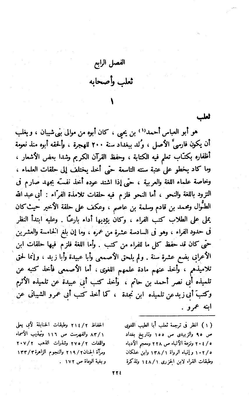 1 انظر في ترجمة ثعلب: أبا الطيب اللغوي ص95، والزبيدي ص155، وتاريخ بغداد 5/ 204. ونزهة الألباء ص228، ومعجم الأدباء 5/ 102، وإنباه الرواة 1/ 138، وابن خلكان, وطبقات القراء لابن الجزري 1/ 148, وتذكرة الحفاظ 2/ 214, وطبقات الحنابلة لأبي يعلى 1/ 83، والفهرست ص116, وتهذيب الأسماء واللغات 2/ 275، وشذرات الذهب 2/ 207، ومرآة الجنان 2/ 219، والنجوم الزاهرة 3/ 133، وبغية الوعاة ص172.