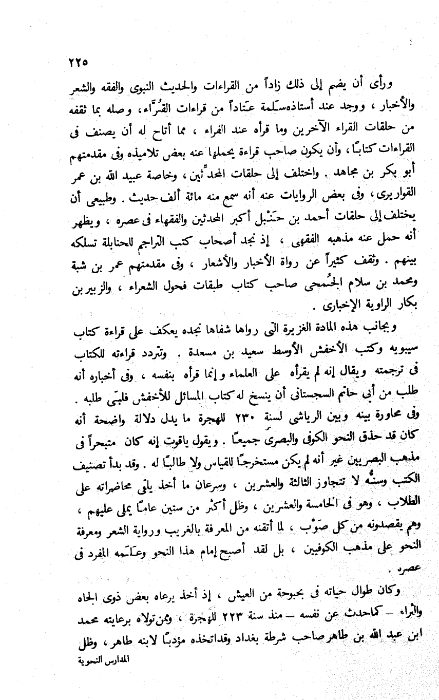 وبجانب هذه المادة الغزيرة التي رواها شفاها نجده يعكف على قراءة كتاب سيبويه وكتب الأخفش الأوسط سعيد بن مسعدة. وتتردد قراءته للكتاب في ترجمته ويقال: إنه لم يقرأه على العلماء وإنما قرأه بنفسه، وفي أخباره أنه طلب من أبي حاتم السجستاني أن ينسخ له كتاب المسائل للأخفش فلبى طلبه. وفي محاورة بينه وبين الرياشي لسنة 230 للهجرة ما يدل دلالة واضحة أنه كان قد حذق النحو الكوفي والبصري جميعا. ويقول ياقوت: إنه كان متبحرا في مذهب البصريين غير أنه لم يكن مستخرجا للقياس ولا طالبا له. وقد بدأ تصنيف الكتب وسنه لا تتجاوز الثالثة والعشرين، وسرعان ما أخذ يلقي محاضراته على الطلاب، وهو في الخامسة والعشرين، وظل أكثر من ستين عاما يملي عليهم، وهم يقصدونه من كل صوب؛ لما أتقنه من المعرفة بالغريب ورواية الشعر ومعرفة النحو على مذهب الكوفيين، بل لقد أصبح إمام هذا النحو وعَلَمه المفرد في عصره.