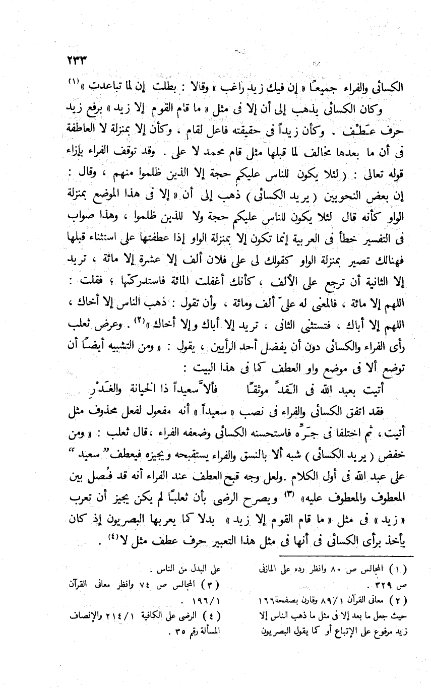 فقد اتفق الكسائي والفراء في نصب "سعيدا" أنه مفعول لفعل محذوف مثل أتيت، ثم اختلفا في جره فاستحسنه الكسائي وضعفه الفراء، قال ثعلب: "ومن خفض "يريد الكسائي" شبه ألا بالنسق والفراء يستقبحه ويجيزه فيعطف "سعيدا" على عبد الله في أول الكلام. ولعل وجه قبح العطف عند الفراء أنه قد فُصل بين المعطوف والمعطوف عليه"3. ويصرح الرضي بأن ثعلبا لم يكن يجيز أن تعرب "زيد" في مثل: "ما قام القوم إلا زيد" بدلا كما يعربها البصريون, إذ كان يأخذ برأي الكسائي في أنها في مثل هذا التعبير حرف عطف مثل لا4.