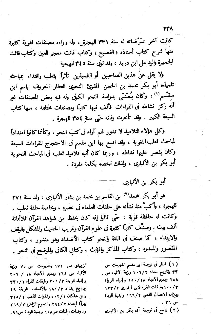 2 راجع في ترجمة أبي بكر بن الأنباري: الزبيدي ص171، والفهرست ص75, ونزهة الألباء ص264, ومعجم الأدباء 18/ 306, وإنباه الرواة 3/ 201، وطبقات القراء 2/ 330، وتاريخ بغداد 3/ 181، والأنساب الورقة 49، وابن خلكان 1/ 502، وشذرات الذهب 2/ 315، ومرآة الجنان 2/ 294، والنجوم الزاهرة 3/ 269، وروضات الجنات ص608، وبغية الوعاة ص91.