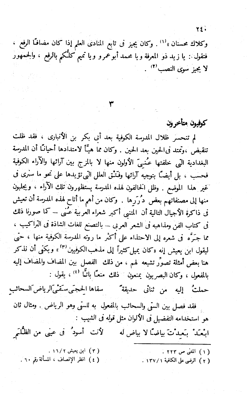 لم تنحسر ظلال المدرسة الكوفية بعد أبي بكر بن الأنباري، فقد ظلت تنقبض، وتمتد في الحين بعد الحين. وكان مما هيأ لامتدادها أحيانا أن المدرسة البغدادية التي خلفتها عُني الأولون منها لا بالمزج بين آرائها والآراء الكوفية فحسب، بل أيضا بتوجيه آرائها وفتق العلل التي تؤيدها على نحو ما سنرى في غير هذا الموضع. وظل الخالفون لهذه المدرسة يستظهرون تلك الآراء، ويجلبون منها إلى مصنفاتهم بعض دررها. وكان من أهم ما أتاح لهذه المدرسة أن تعيش في ذاكرة الأجيال التالية, أن المتنبي أكبر شعراء العربية عني -كما صورنا ذلك في كتاب: الفن ومذاهبه في الشعر العربي- بالتصنع للغات الشاذة في التراكيب، مما جره في شعره إلى الاحتذاء على أكثر ما روته المدرسة الكوفية منها، حتى ليقول ابن يعيش: إنه "كان يميل كثيرا إلى مذهب الكوفيين"1, ويكفي أن نذكر هنا بعض أمثلة تصور تشيعه لهم، من ذلك الفصل بين المضاف والمضاف إليه بالمفعول، وكان البصريون يمنعون ذلك منعا باتا2، يقول: