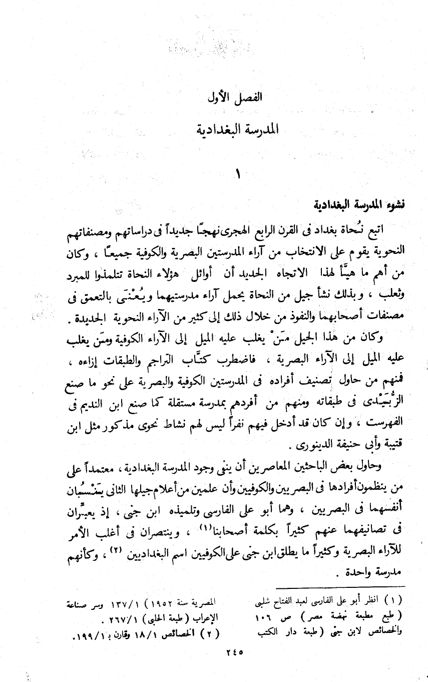 وحاول بعض الباحثين المعاصرين أن ينفي وجود المدرسة البغدادية، معتمدا على من ينظمون أفرادها في البصريين والكوفيين, وأن علمين من أعلام جيلها الثاني ينسبان أنفسهما في البصريين، وهما أبو علي الفارسي وتلميذه ابن جني، إذ يعبران في تصانيفهما عنهم كثيرا بكلمة أصحابنا1، وينتصران في أغلب الأمر للآراء البصرية وكثيرا ما يطلق ابن جني على الكوفيين اسم البغداديين2، وكأنهم مدرسة واحدة.