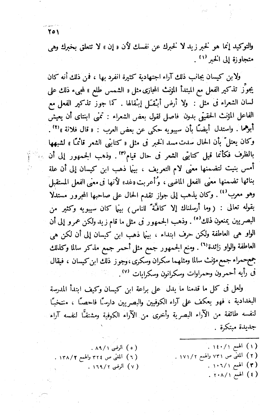 واستدل أيضا بأن سيبويه حكى عن بعض العرب: "قال فلانة"2. وكان يعتل بأن الحال سدت مسد الخبر في مثل: "كتابتي الشعر قائما" لشبهها بالظرف فكأنما قيل: كتابتي الشعر في حال قيام3. وذهب الجمهور إلى أن أمس بُنيت لتضمنها معنى لام التعريف، بينما ذهب ابن كيسان إلى أن علة بنائها تضمنها معنى الفعل الماضي، وأُعربت "غد" لأنها في معنى الفعل المستقبل وهو معرب4. وكان يذهب إلى جواز تقدم الحال على صاحبها المجرور, مستدلا بقوله تعالى: {وَمَا أَرْسَلْنَاكَ إِلَّا كَافَّةً لِلنَّاسِ} بينما كان سيبويه وكثير من البصريين يمنعون ذلك5. وذهب الجمهور في مثل: ما قام زيد ولكن عمرو إلى أن الواو هي العاطفة ولكن حرف ابتداء، بينما ذهب ابن كيسان إلى أن لكن هي العاطفة والواو زائدة6. ومنع الجمهور جمع مثل أحمر جمع مذكر سالما وكذلك جمع حمراء جمع مؤنث سالما ومثلهما سكران وسكرى، وجوز ذلك ابن كيسان، فيقال في رأيه: أحمرون وحمراوات وسكرانون وسكرايات7.