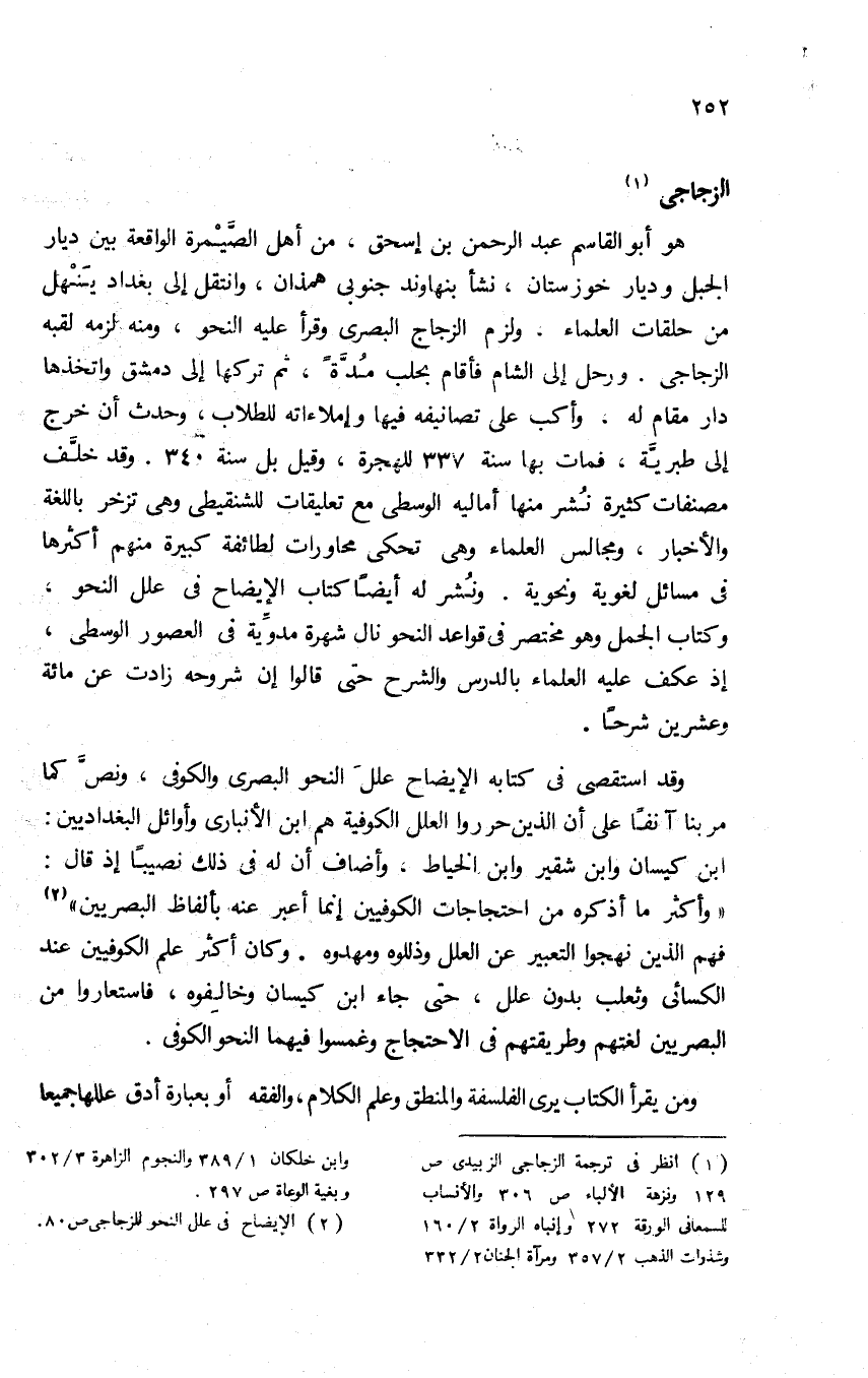 1 انظر في ترجمة الزجاجي: الزبيدي ص129، ونزهة الألباء ص306, والأنساب للسمعاني الورقة 272، وإنباه الرواة 2/ 160، وشذرات الذهب 2/ 357، ومرآة الجنان 2/ 332، وابن خلكان 1/ 389، والنجوم الزاهرة 3/ 302، وبغية الوعاة ص297.