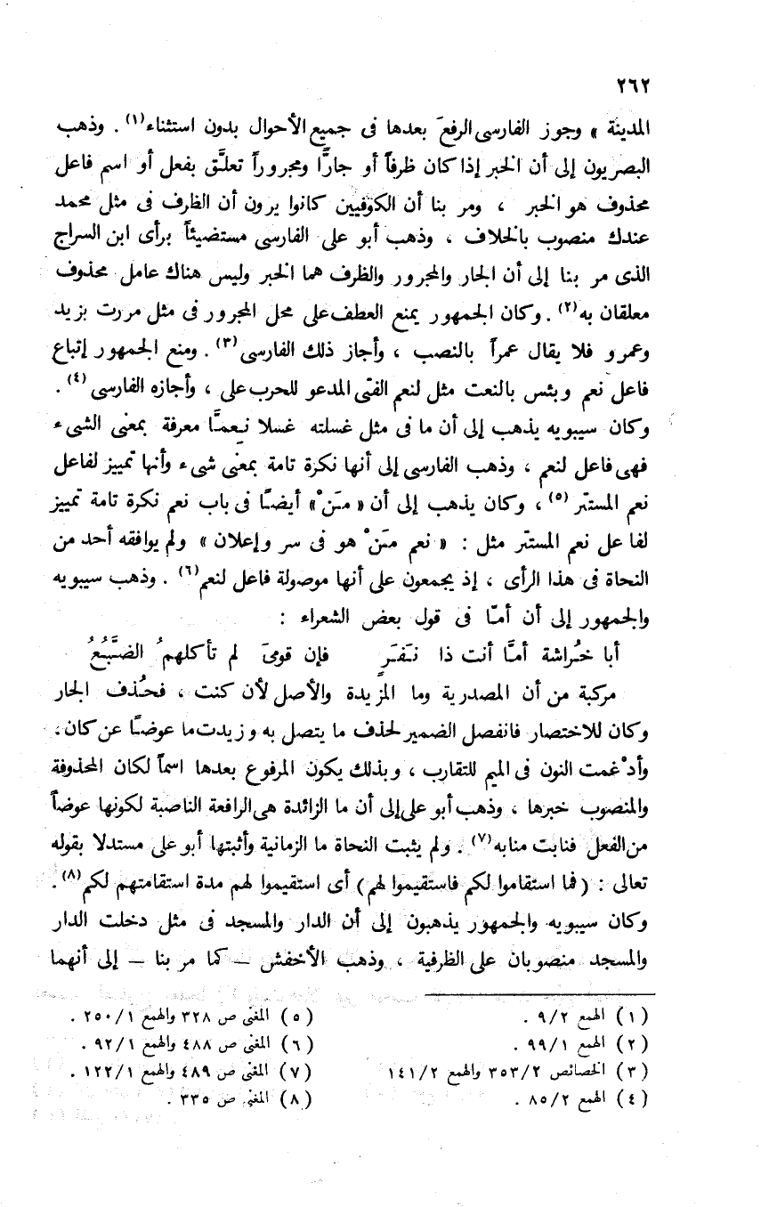 المدينة" وجوز الفارسي الرفع بعدها في جميع الأحوال بدون استثناء1. وذهب البصريون إلى أن الخبر إذا كان ظرفا أو جارا ومجرورا تعلق بفعل أو اسم فاعل محذوف هو الخبر، ومر بنا أن الكوفيين كانوا يرون أن الظرف في مثل: محمد عندك, منصوب بالخلاف، وذهب أبو علي الفارسي مستضيئا برأي ابن السراج الذي مر بنا إلى أن الجار والمجرور والظرف هما الخبر -وليس هناك عامل محذوف- معلقان به2. وكان الجمهور يمنع العطف على محل المجرور في مثل: مررت بزيد وعمرو فلا يقال: عمرا بالنصب، وأجاز ذلك الفارسي3. ومنع الجمهور إتباع فاعل نعم وبئس بالنعت مثل: لنعم الفتى المدعو للحرب علي، وأجازه الفارسي4. وكان سيبويه يذهب إلى أن ما في مثل: غسلته غسلا نِعِمَّا معرفة بمعنى الشيء, فهي فاعل لنعم، وذهب الفارسي إلى أنها نكرة تامة بمعنى شيء وأنها تمييز لفاعل نعم المستتر5، وكان يذهب إلى أن "مَنْ" أيضا في باب نعم نكرة تامة تمييز لفاعل نعم المستتر مثل: "نعم من هو في سر وإعلان" ولم يوافقه أحد من النحاة في هذا الرأي، إذ يجمعون على أنها موصولة فاعل لنعم6. وذهب سيبويه والجمهور إلى أن أمّا في قول بعض الشعراء:
