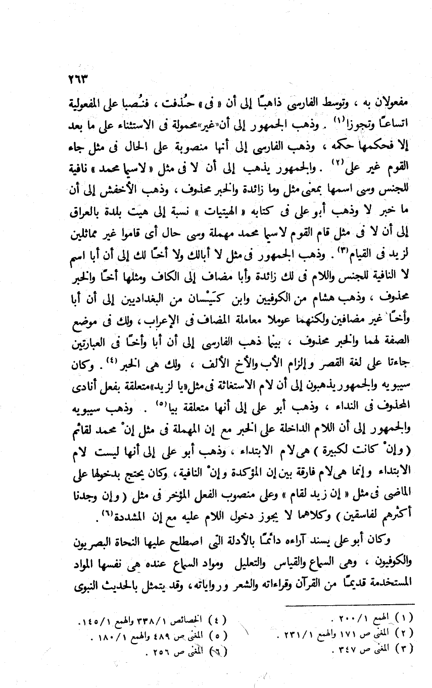 مفعولان به، وتوسط الفارسي ذاهبا إلى أن "في" حُذفت، فنُصبا على المفعولية اتساعا وتجوزا1. وذهب الجمهور إلى أن "غير" محمولة في الاستثناء على ما بعد إلا فحكمها حكمه، وذهب الفارسي إلى أنها منصوبة على الحال في مثل: جاء القوم غيرَ علي2. والجمهور يذهب إلى أن لا في مثل: "لا سيما محمد" نافية للجنس وسي اسمها بمعنى مثل وما زائدة والخبر محذوف، وذهب الأخفش إلى أن ما خبر لا وذهب أبو علي في كتابه "الهيتيات" نسبة إلى هيت بلدة بالعراق إلى أن لا في مثل: قام القوم لا سيما محمد, مهملة وسي حال أي: قاموا غير مماثلين لزيد في القيام3. وذهب الجمهور في مثل: لا أبا لك ولا أخا لك إلى أن أبا اسم لا النافية للجنس واللام في لك زائدة وأبا مضاف إلى الكاف ومثلها أخا والخبر محذوف، وذهب هشام من الكوفيين وابن كيسان من البغداديين إلى أن أبا وأخا غير مضافين ولكنهما عُوملا معاملة المضاف في الإعراب، ولك في موضع الصفة لهما والخبر محذوف، بينما ذهب الفارسي إلى أن أبا وأخا في العبارتين جاءتا على لغة القصر وإلزام الأب والأخ الألف، ولك هي الخبر4. وكان سيبويه والجمهور يذهبون إلى أن لام الاستغاثة في مثل: "يا لزيد" متعلقة بفعل أنادي المحذوف في النداء، وذهب أبو علي إلى أنها متعلقة بيا5. وذهب سيبويه والجمهور إلى أن اللام الداخلة على الخبر مع إن المهملة في مثل: إنْ محمد لقائم "وإن كانت لكبيرة" هي لام الابتداء، وذهب أبو علي إلى أنها ليست لام الابتداء وإنما هي لام فارقة بين إن المؤكدة وإن النافية، وكان يحتج بدخولها على الماضي في مثل: "إن زيد لقام" وعلى منصوب الفعل المؤخر في مثل: {وَإِنْ وَجَدْنَا أَكْثَرَهُمْ لَفَاسِقِينَ} وكلاهما لا يجوز دخول اللام عليه مع إن المشددة6.